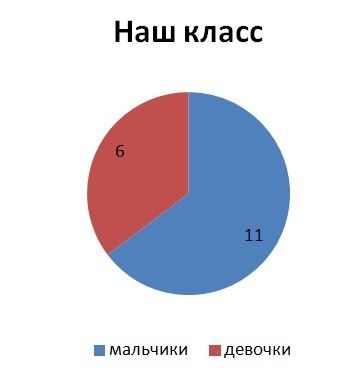 Постройте круговую диаграмму,изображающую процентный состав мальчиков и девочек вашего класса всего - 17 чел. мальчиков-11 девочек-6