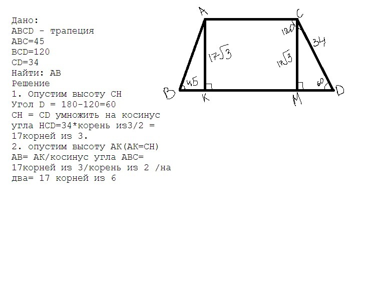 Найдите боковую сторону AB трапеции ABCD, если углы ABC и BCD равны соответственно 45° и 120°, а CD=34. С рисунком и дано,пожалуйста