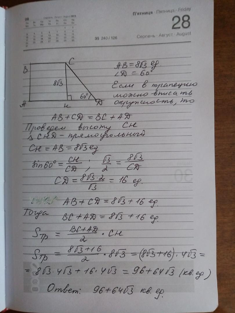 Меньшая боковая сторона прямоугольной трапеции равна 8 корень из 3,а острый угол 60 градусов,найдите площадь трапеции если в нее можно вписать окружность