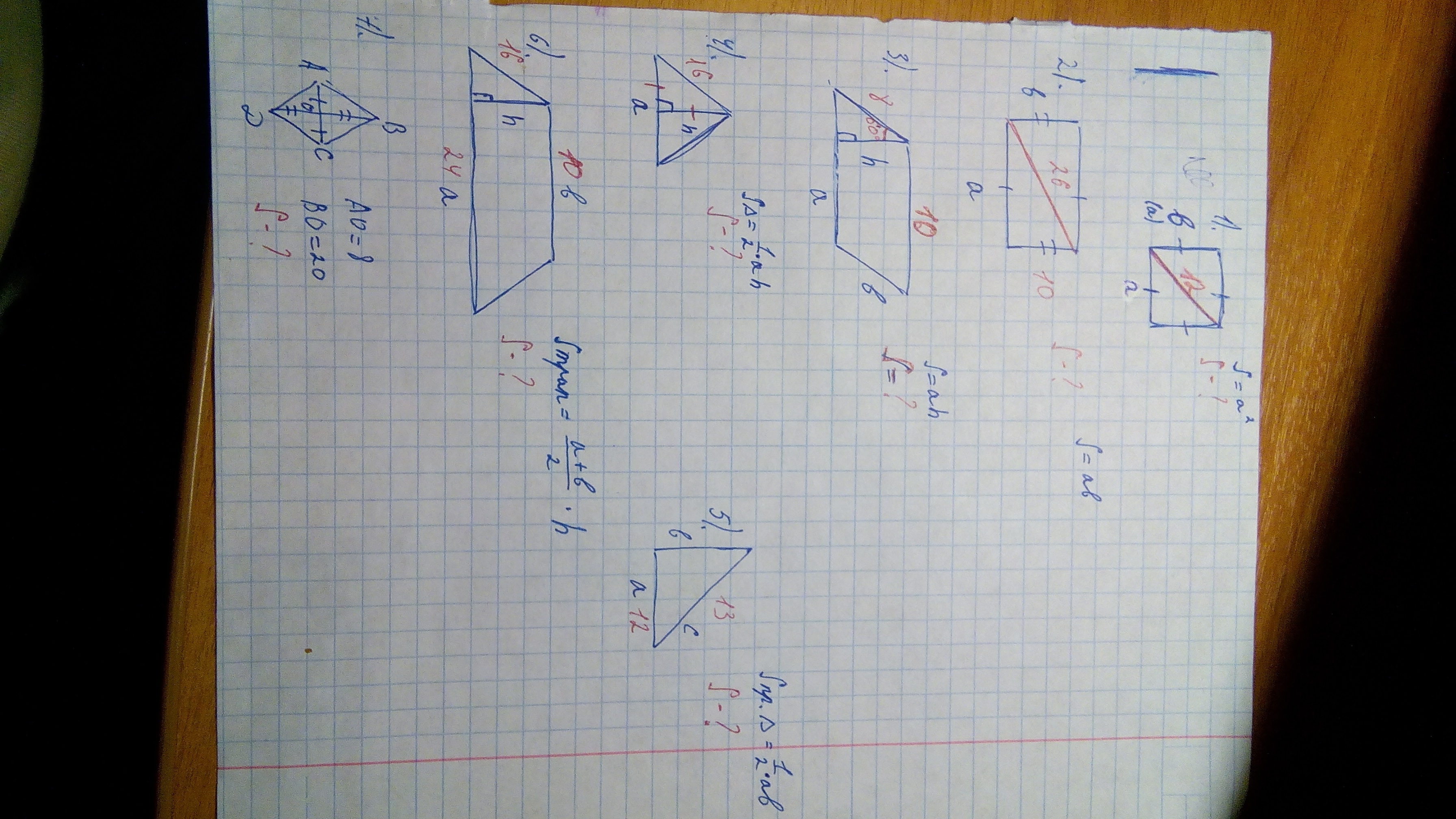 Найдите пожалуйста площади всех изображенных фигур. Их основные формулы я выписал рядом с фигурами. По данным на бумаге надо найти все площади этих фигур. Учитель сказал, что они в основном решаются через теорему Пифагора и по основным теоремам о прямоугольном треугольнике.