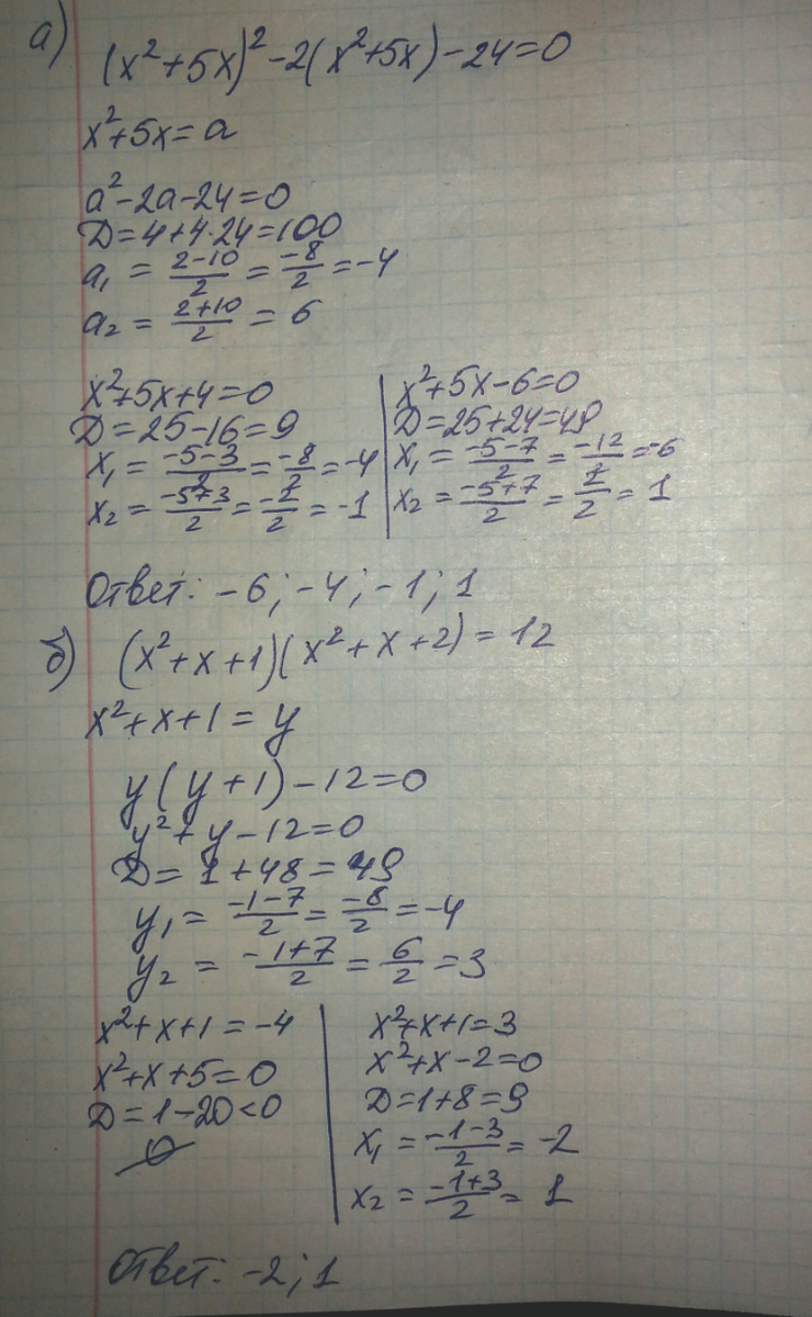 а) (x^2+5x)^2 - 2(x^2+5x) - 24 = 0