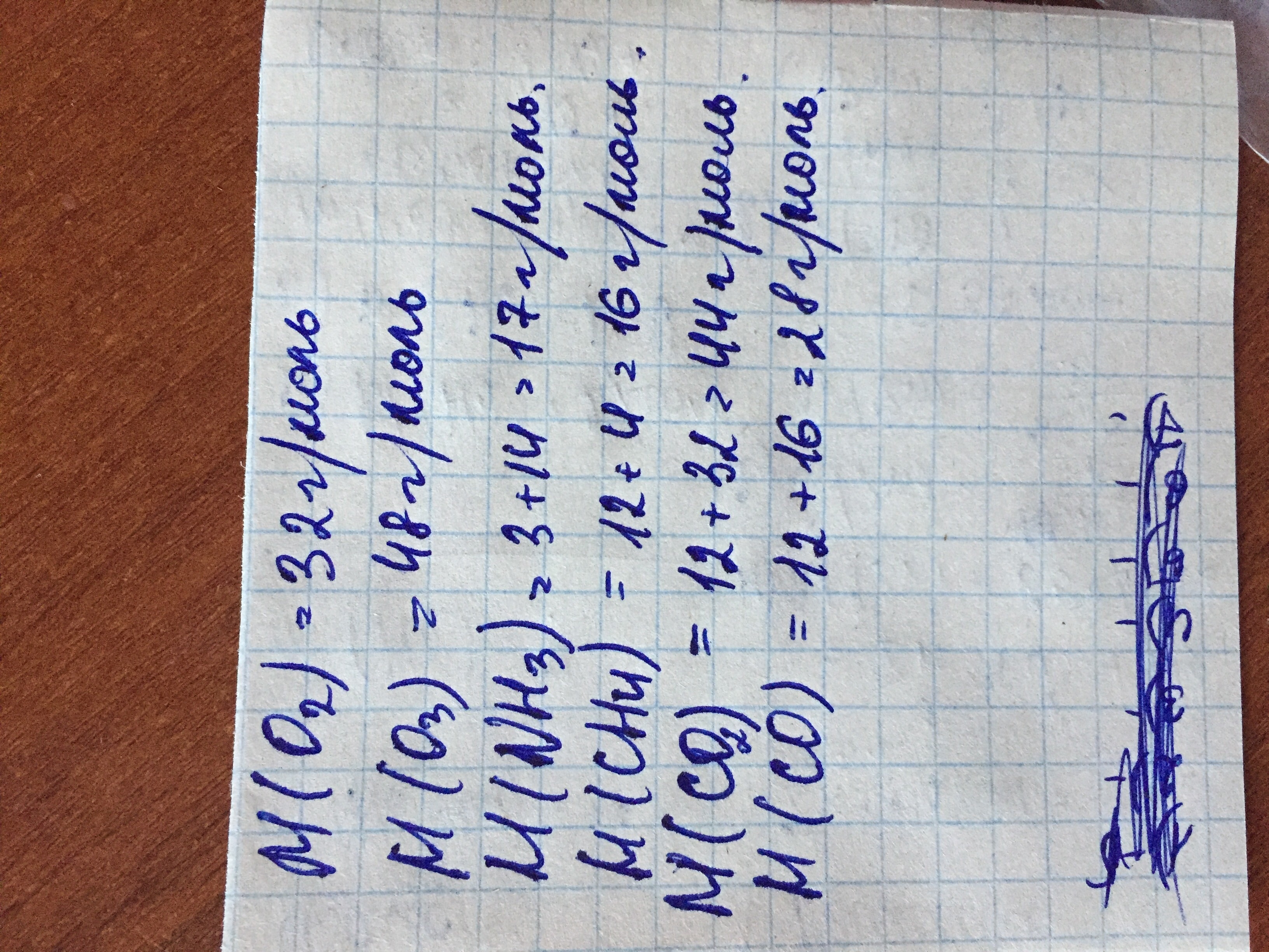 вычислите относительные малекулярные массы газов: кислорода O2,озона O3,аммиака NH3, метанаCH4,угарный газ co, углекислого газа co2 и определите их относительную плотность по водороду