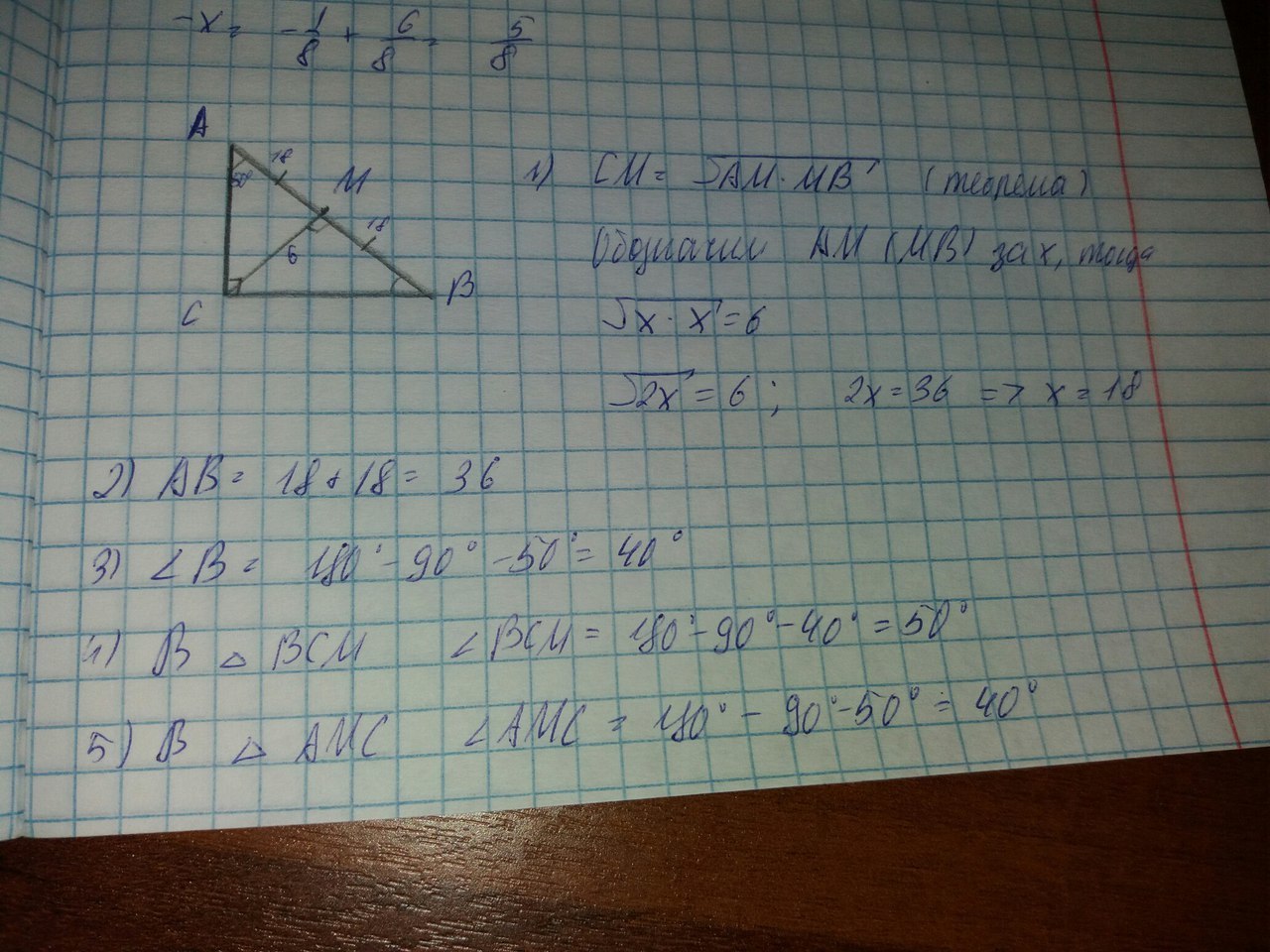 Дано: треугольник abс, угол а=50 градусов, угол с=90 градусов, CM=6см, BM=MA Найти: ab=?, угол BCM=?, угол AMC=?