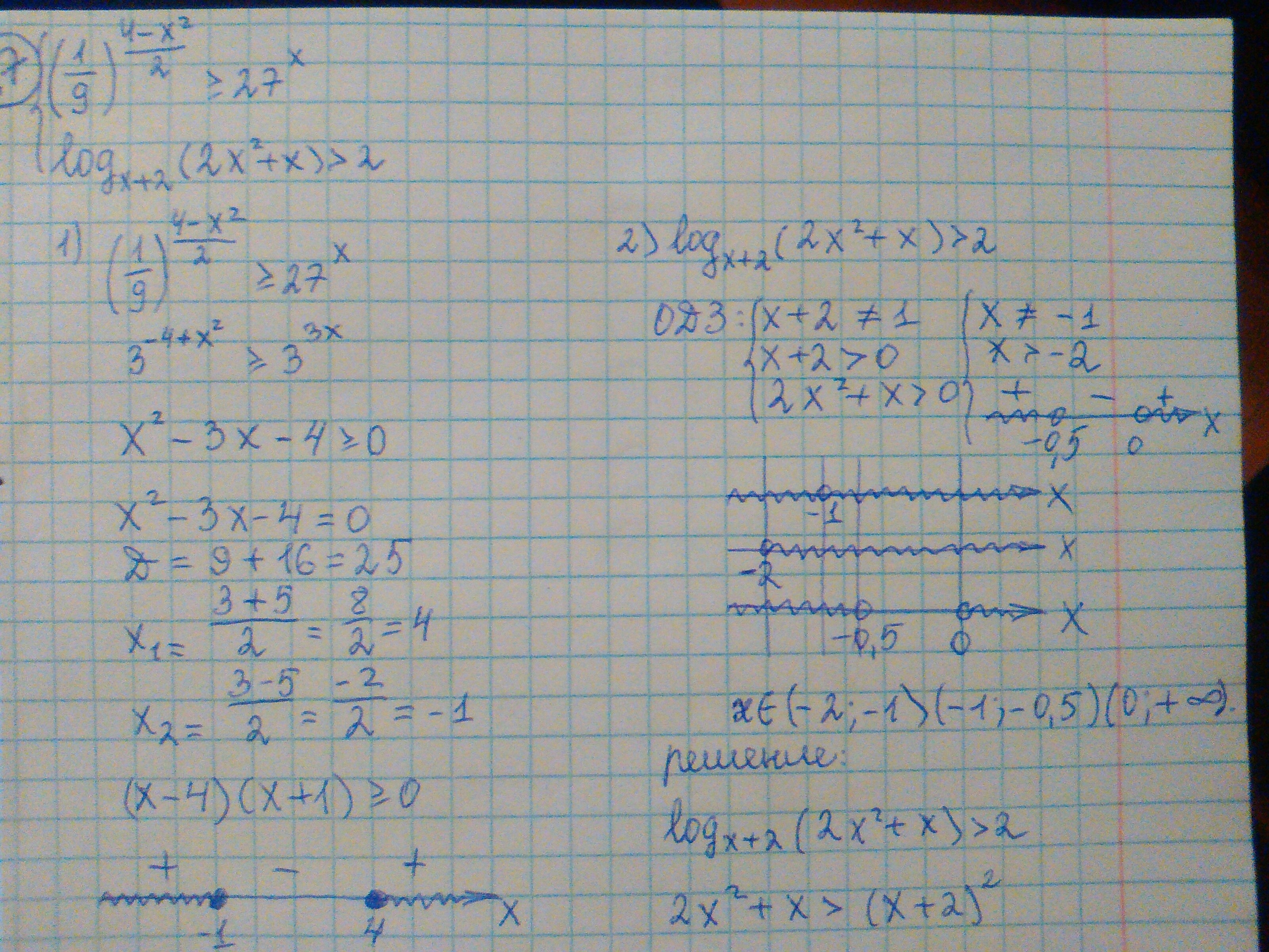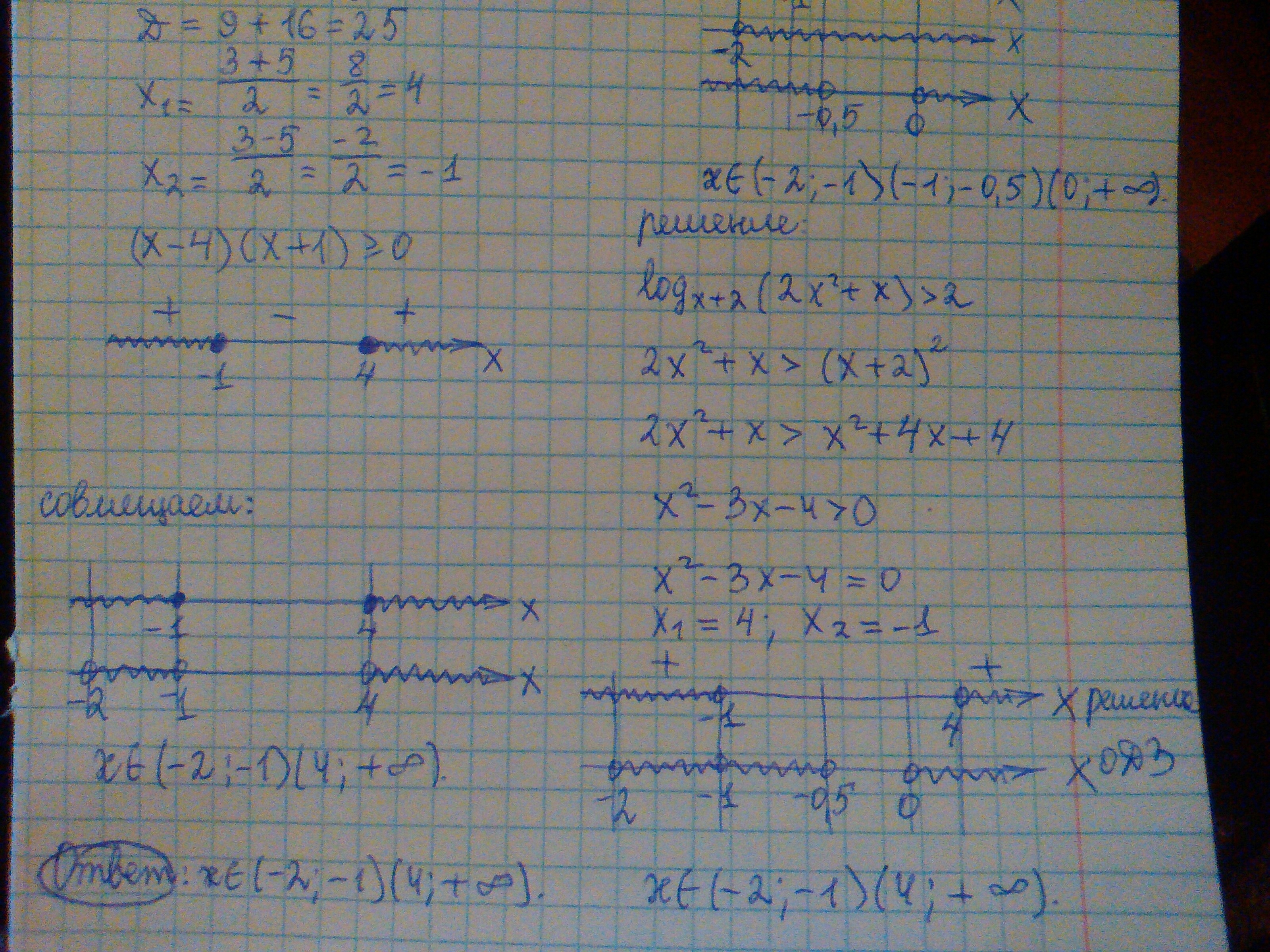 ![log_{x+2}(2x^2+x) textgreater 2 \ \ log_{x+2}(2x^2+x) textgreater 2log_{x+2}(x+2) \ \ log_{x+2}(2x^2+x) textgreater log_{x+2}(x+2)^2 textless = textgreater \ \ textless = textgreater (x+2-1)[2x^2+x-(x+2)^2] textgreater 0 \ \ (x+1)(2x^2+x-x^2-4x-4) textgreater 0 \ \ (x+1)(x^2-3x-4) textgreater 0 \ \ (x+1)(x+1)(x-4) textgreater 0 log_{x+2}(2x^2+x) textgreater 2 \ \ log_{x+2}(2x^2+x) textgreater 2log_{x+2}(x+2) \ \ log_{x+2}(2x^2+x) textgreater log_{x+2}(x+2)^2 textless = textgreater \ \ textless = textgreater (x+2-1)[2x^2+x-(x+2)^2] textgreater 0 \ \ (x+1)(2x^2+x-x^2-4x-4) textgreater 0 \ \ (x+1)(x^2-3x-4) textgreater 0 \ \ (x+1)(x+1)(x-4) textgreater 0](https://tex.z-dn.net/?f=log_%7Bx%2B2%7D%282x%5E2%2Bx%29+textgreater++2+%5C+%5C+log_%7Bx%2B2%7D%282x%5E2%2Bx%29+textgreater++2log_%7Bx%2B2%7D%28x%2B2%29+%5C++%5C+log_%7Bx%2B2%7D%282x%5E2%2Bx%29+textgreater++log_%7Bx%2B2%7D%28x%2B2%29%5E2++++textless++%3D+textgreater+++%5C++%5C++++textless++%3D+textgreater+++++%28x%2B2-1%29%5B2x%5E2%2Bx-%28x%2B2%29%5E2%5D+textgreater++0+%5C++%5C+%28x%2B1%29%282x%5E2%2Bx-x%5E2-4x-4%29+textgreater++0+%5C+%5C+%28x%2B1%29%28x%5E2-3x-4%29+textgreater++0+%5C+%5C+%28x%2B1%29%28x%2B1%29%28x-4%29+textgreater++0)