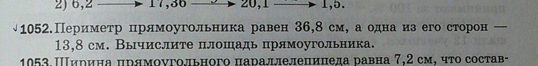 Р=2(а+в) надо решить уравнение подставив в формулу периметра вместо а=13,8 и вместо Р=36,8 получим 2(13,8+в)=36,8