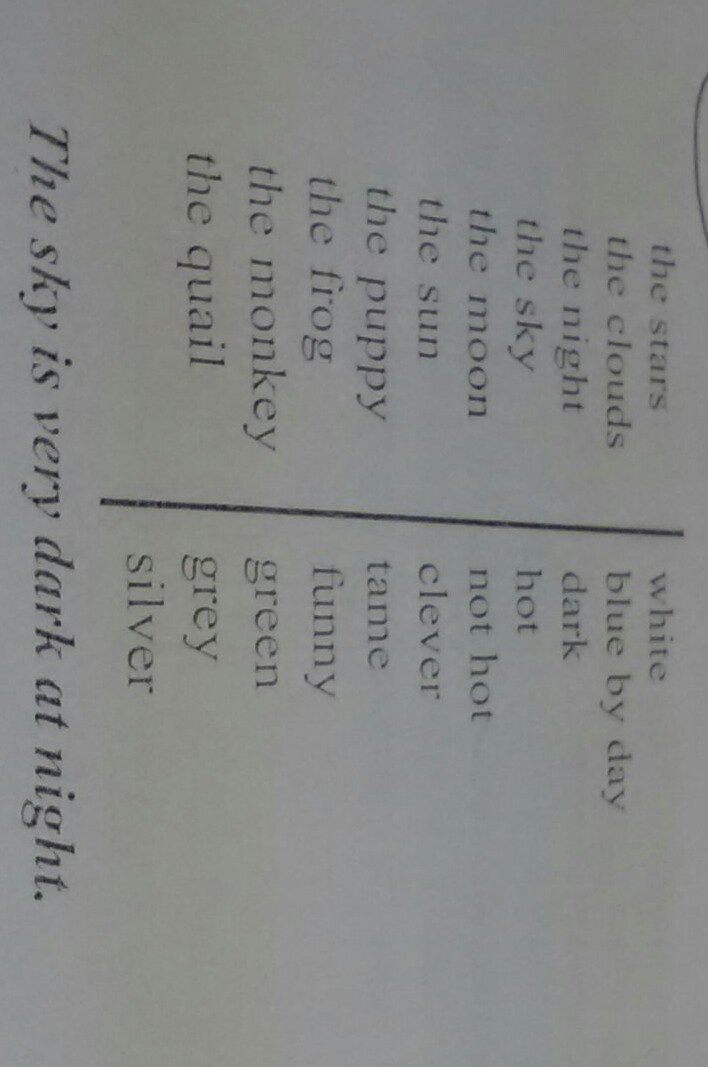 The stars are silver. The clouds are white. The night is dark. The sky is blue by day. The moon is not hot. The sun is hot. The puppy is tame. The frog is green. The monkey is funny. The quail is grey.