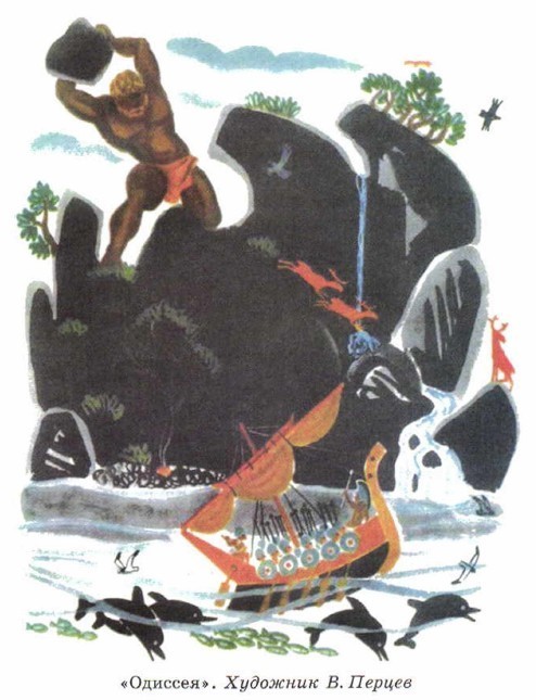 На иллюстрации изображен последний эпизод поэмы "Одиссея",когда, услышав речь Одиссея циклоп Полифем хватает кусок скалы и собирается ее кинуть в сторону корабля. Огромный циклоп на фоне огромных скал и огромного тела Полифема Одиссейобращается с бесстрашием к чудовищу.