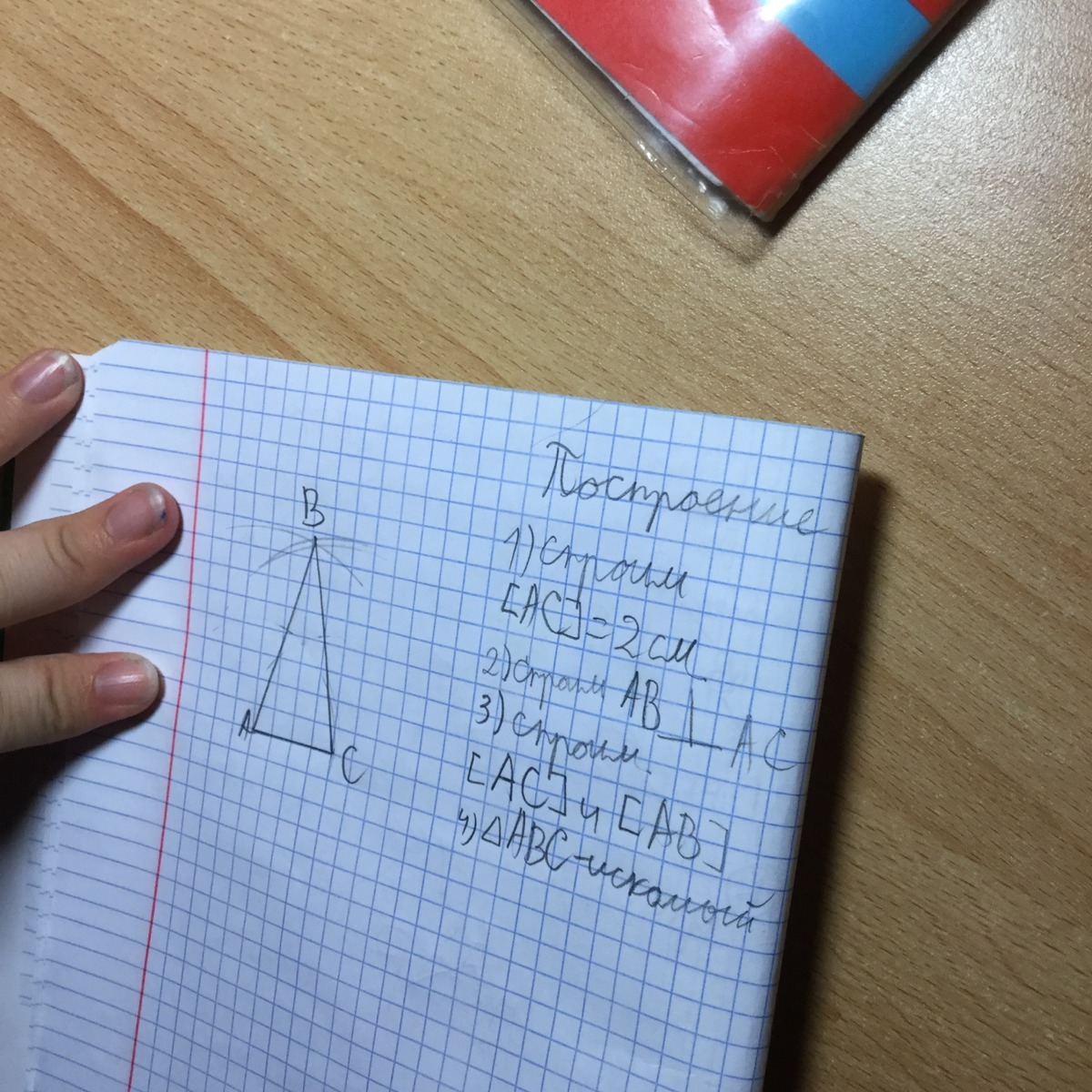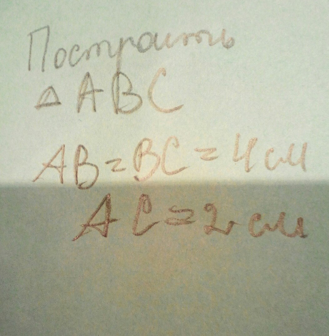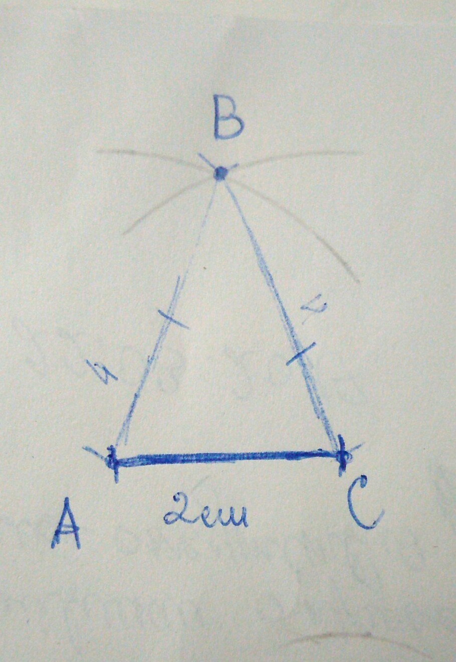 В общем рисуешь две точки, А и С, между ними расстояние 2 сантиметра. на циркуле выставляешь 4 сантиметра и из точек А и С чиркаешь дуги (как на рисунке) пересечение этих дуг будет вершина и собственно точка В. Ну и соединяешь эти точки и получается треугольник нужный тебе АВС..