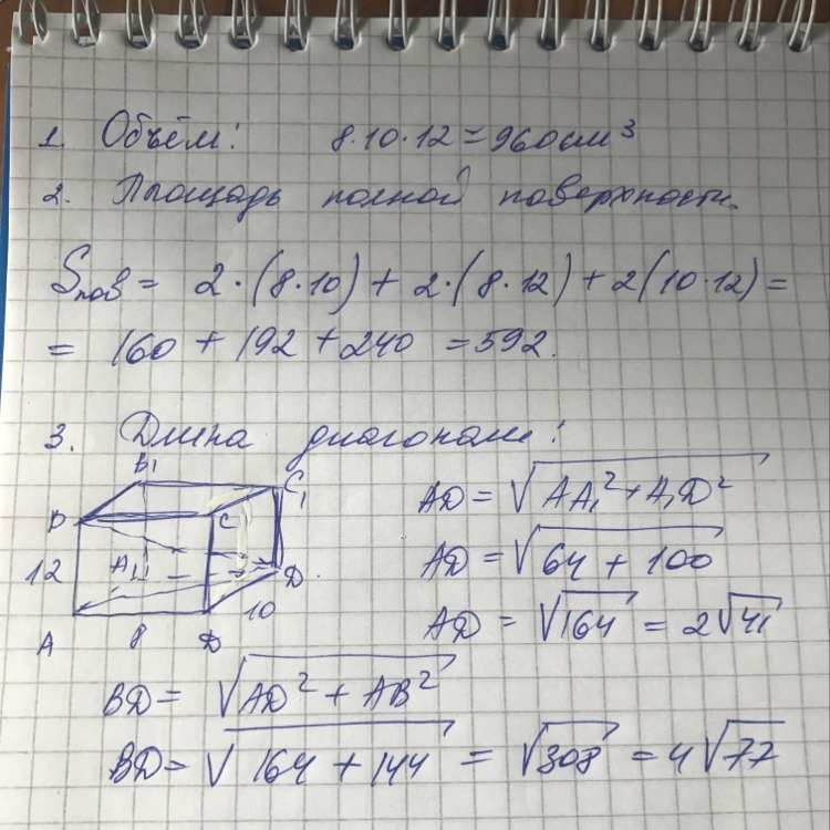 Длины ребер прямоугольного параллелепипеда равны 8,10,12 см. Найти длины его диагоналей,площадь полной поверхности,объем