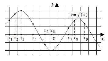 На рисунке изображён график дифференцируемой функции y = ƒ(x). На оси абсцисс отмечены девять точек: x1, x2, x3, ..., x9 . Среди этих точек найдите все точки, в которых производная функции ƒ(x) отрицательна. В ответе укажите количество найденных точек.