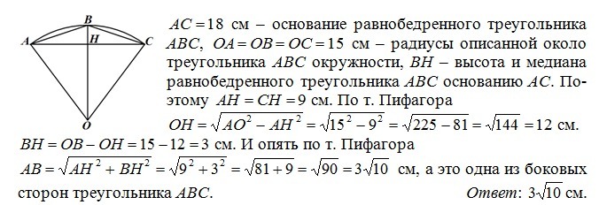 Основание равнобедренного тупоугольного треугольника равна 18 см, а радиус описанной около него окружности - 15 см. Найдите боковую сторону треугольника