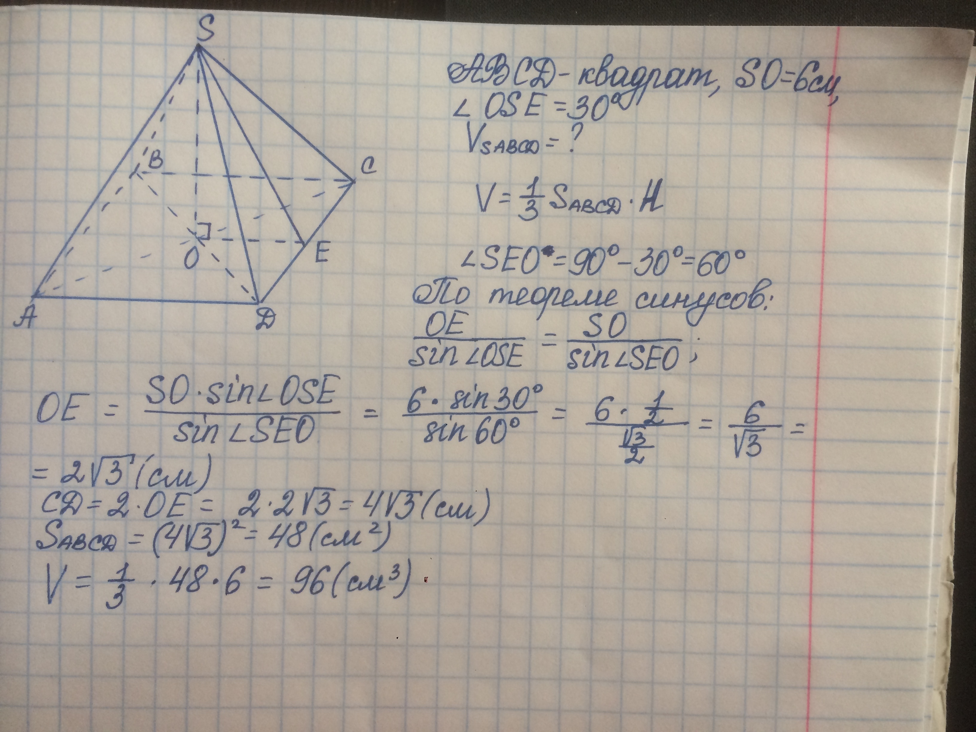 высота правильной четырехугольной пирамиды равна 6 см и образует с боковой гранью угол 30 градусов.Найдите объем пирамиды