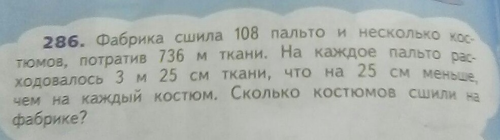 736-351=385 м ткани - израсходовано на все костюмы