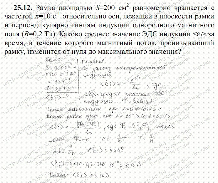 ее плоскости перпендикулярно линиям индукции однородного магнитного поля. Площадью рамки – 200см2, частота вращения – 10об/с. Среднее значение ЭДС индукции за время, в течение которого магнитный поток, пронизывающий рамку, изменяется от нуля до максимального значения равно 0,08 В. Определить величину магнитной индукции данного поля.