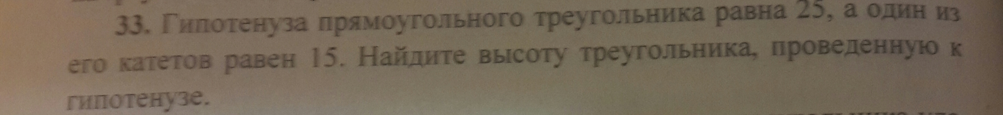 c=25; a=15. Второй катет находим по теореме Пифагора: b^2=25^2-15^2=20^2; b=20 (на самом деле эти операции я не производил, так как заметил, что этот треугольник - увеличенный в пять раз египетский треугольник 3-4-5).