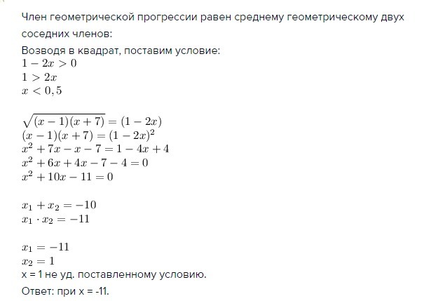 При якому значенні х значення виразів х-1, 1-2х і х+7 будуть послідовними членами геометричної прогресії?