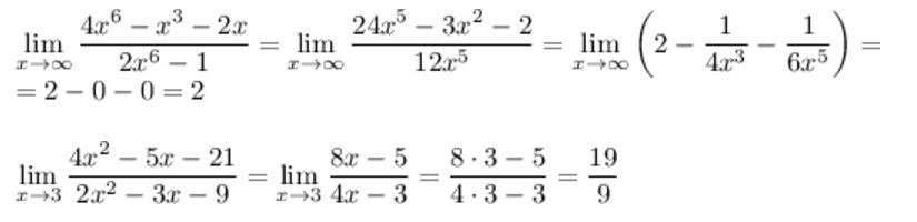 {вообще, первый предел просто равен отношению старших степеней = 4/2, а во втором (4x^2 - 5x - 21)/(2x^2 - 3x - 9) = (4x + 7)(x - 3) / (2x + 3)(x - 3) = (4x + 7)/(2x + 3) = 19/9}