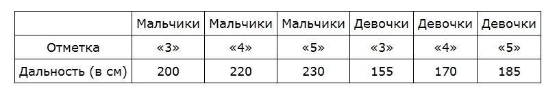 215 м находится между 200 и 220. За прыжок на расстояние от 200 м до 219 м ставят "3" , значит если мальчик прыгнет на 215 м , то согласно таблицы, ему поставят оценку -"3"