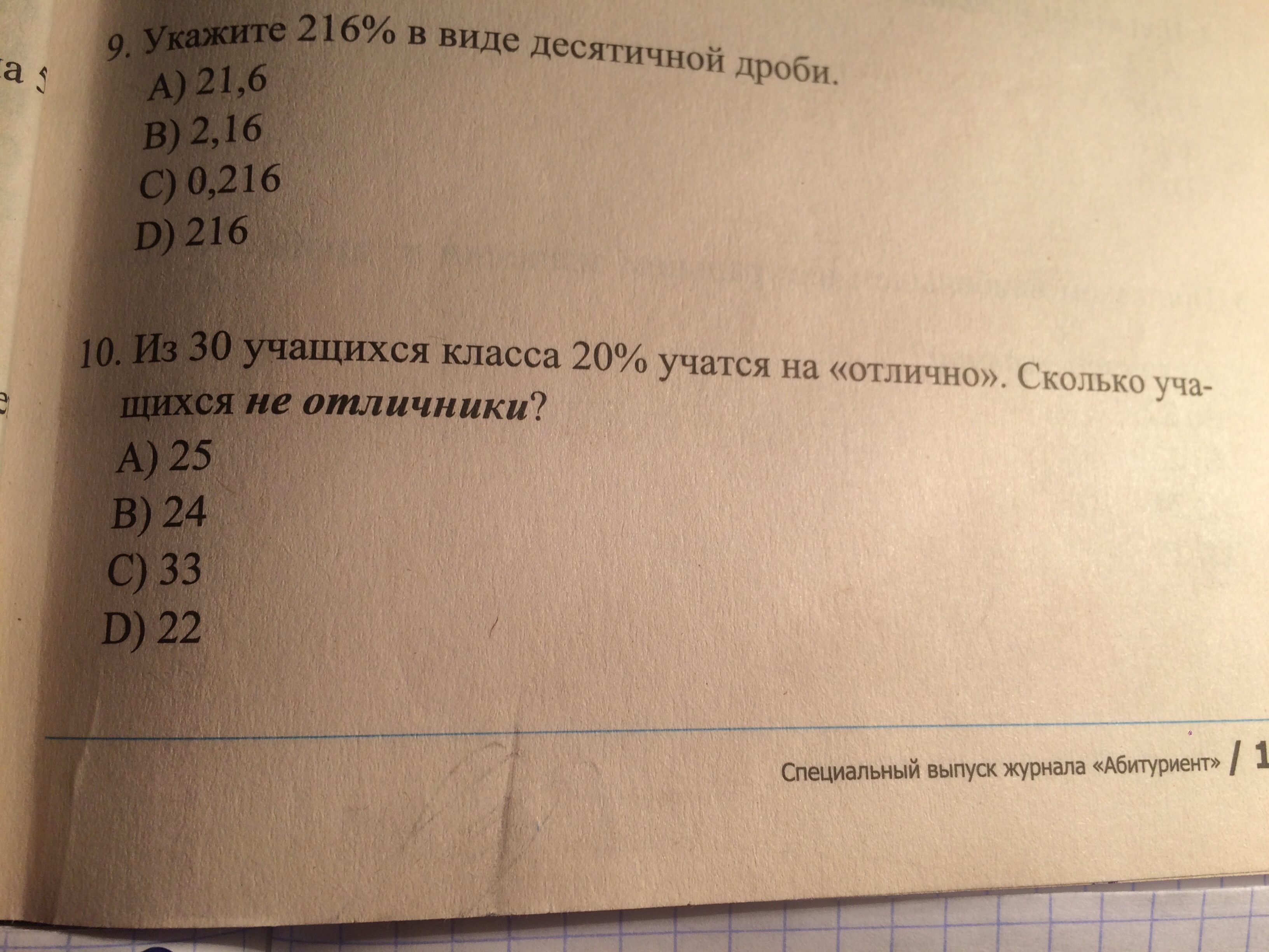 9) Для того, что бы проценты перевести в число нужно поделить на 100. Отсюда 216/100=2,16. Ответ: В).