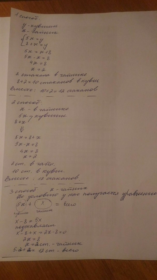 В кувшине в 5 раз больше воды чем в чайнике. На 8 стаканов воды меньше чем в кувшине. Сколько стаканов воды в кувшине и в чайнике вместе?