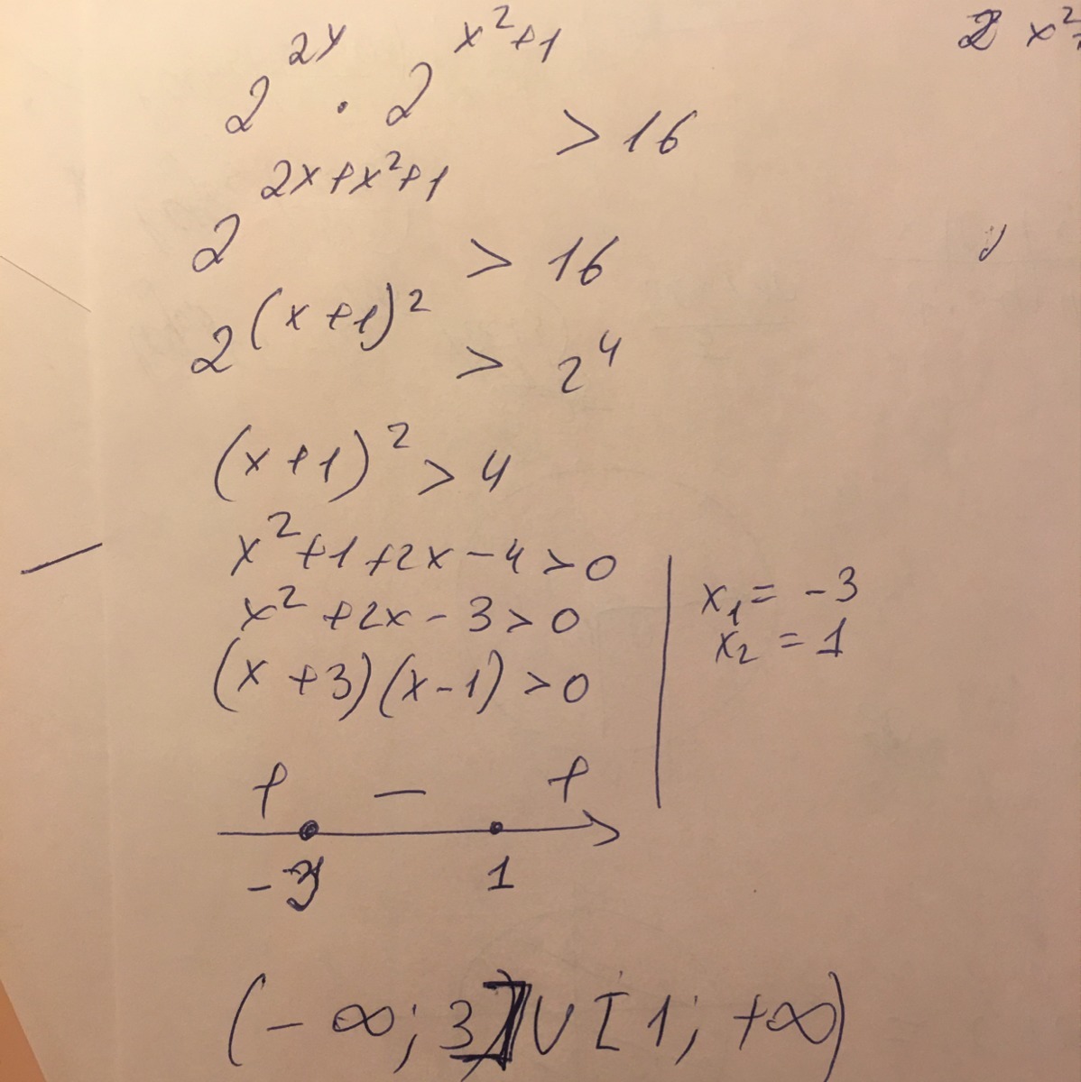 спасибо, но какое-то странное решение ,вы уверены что решали именно это неравенство 4 в степени икс умножить на 2 в степени икс в квадрате плюс 1 и всё это больше 16