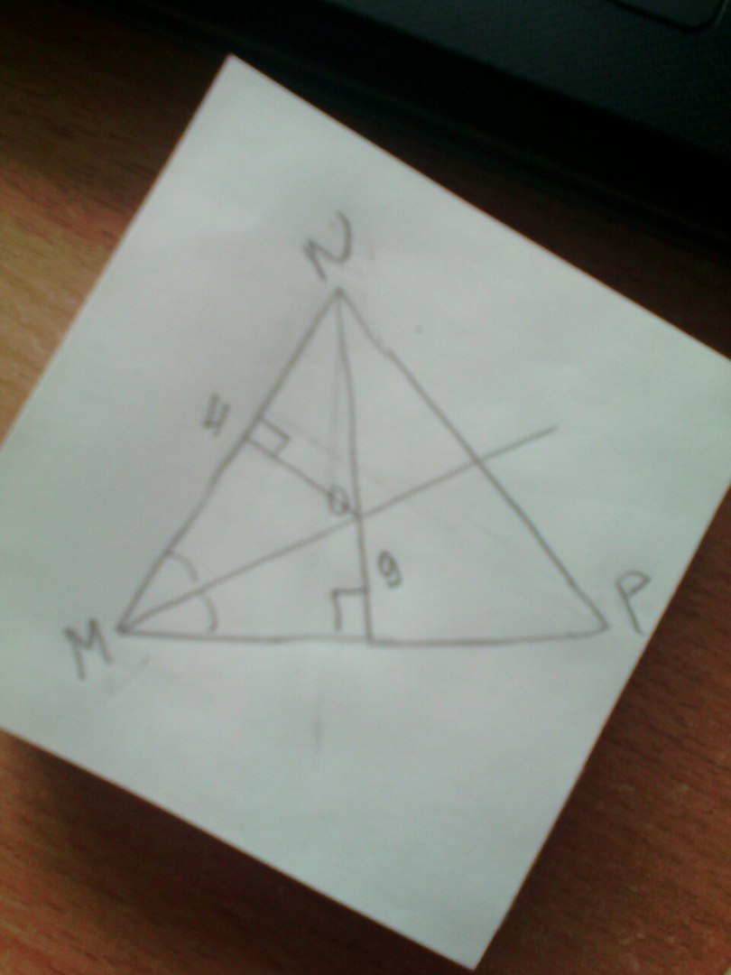 1 В остроугольном треугольнике MNP биссектриса угла М пересекает высоту NK в точке О, причем ОК = 9 см. Найдите расстояние ОН от точки О до прямой MN.
