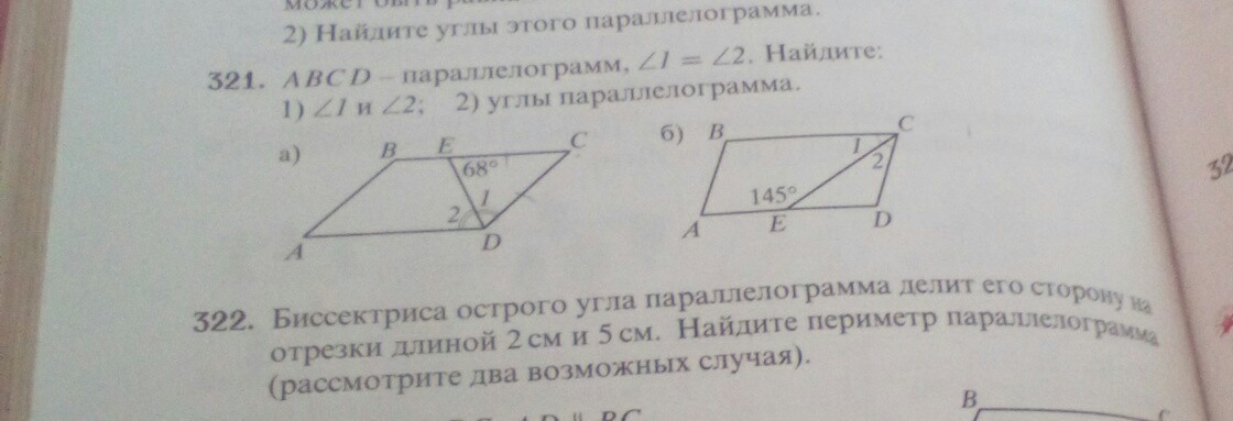 321. а) угол 2 равен углу 68 градусов как накрест лежащие ( прямая, содержащая отрезок BС параллельна прямой, срдержащей AD, а ED принадлежит прямой их пересекающей). Угол 1 = углу 2=68, угол C= 180-2*68=44 градуса