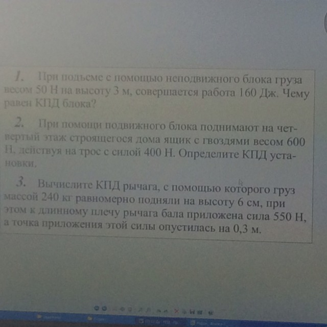 3) n=m*g*L1/(F*L2)=240*10*0.06/(550*0.3)=0.87 (87%)