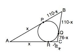 В треугольник ABC вписана окружность, которая касается сторон AB, BC и CA в точках P, Q и R. Найдите AP, если AB=110 см, BC=58 см, CA=76 см.