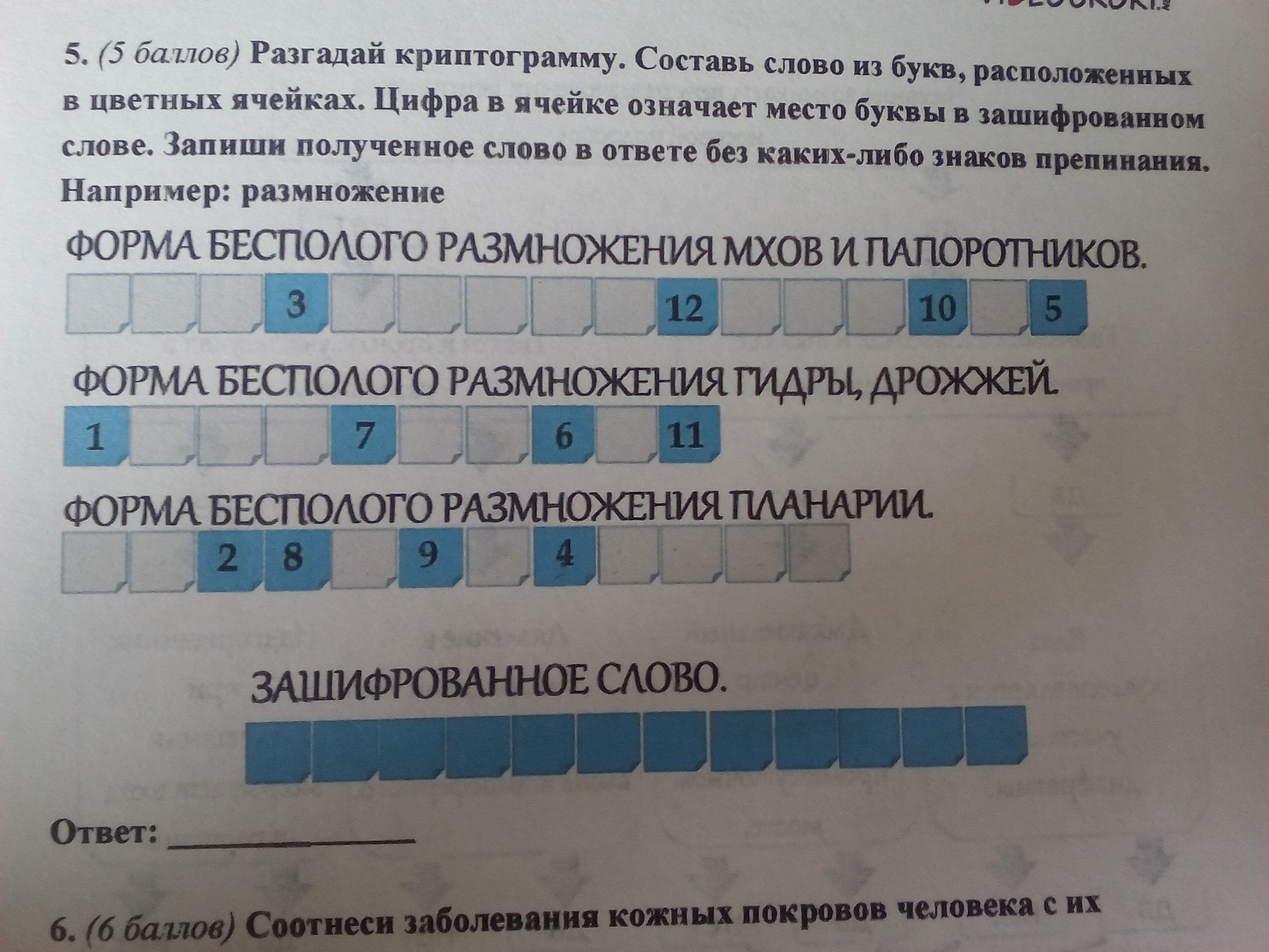 Составь слово из букв, расположенных в цветных ячейках. Цифра в ячейке означает место буквы в зашифрованном слове. Запиши полученное слово в ответе без каких-либо знаков препинания.