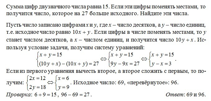Сумма цифр двузначного числа равна 15. Если эти цифры поменять местами, то получится число, которое на 27 больше исходного. Найдите эти числа.