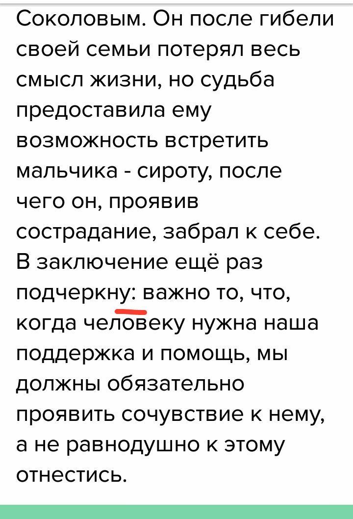 В заключение ещё раз подчеркну: важно то, что, когда человеку нужна наша поддержка и помощь, мы должны обязательно проявить сочувствие к нему, а не равнодушно к этому отнестись.