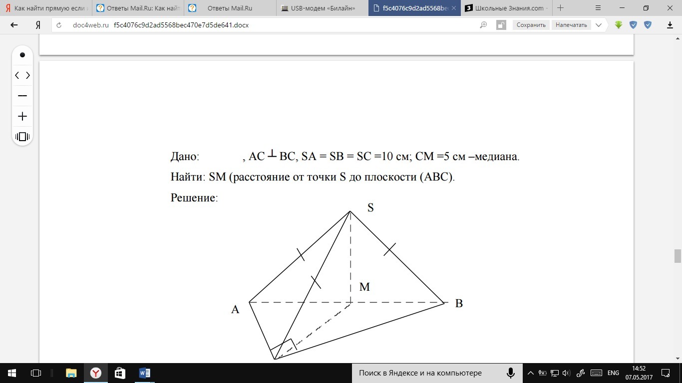 Дано:ΔABС, АС ┴ ВС, SA = SB = SC =10 см; СМ =5 см –