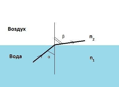Поскольку луч света идет из воды в воздух (n₁>n₂), то β>α.