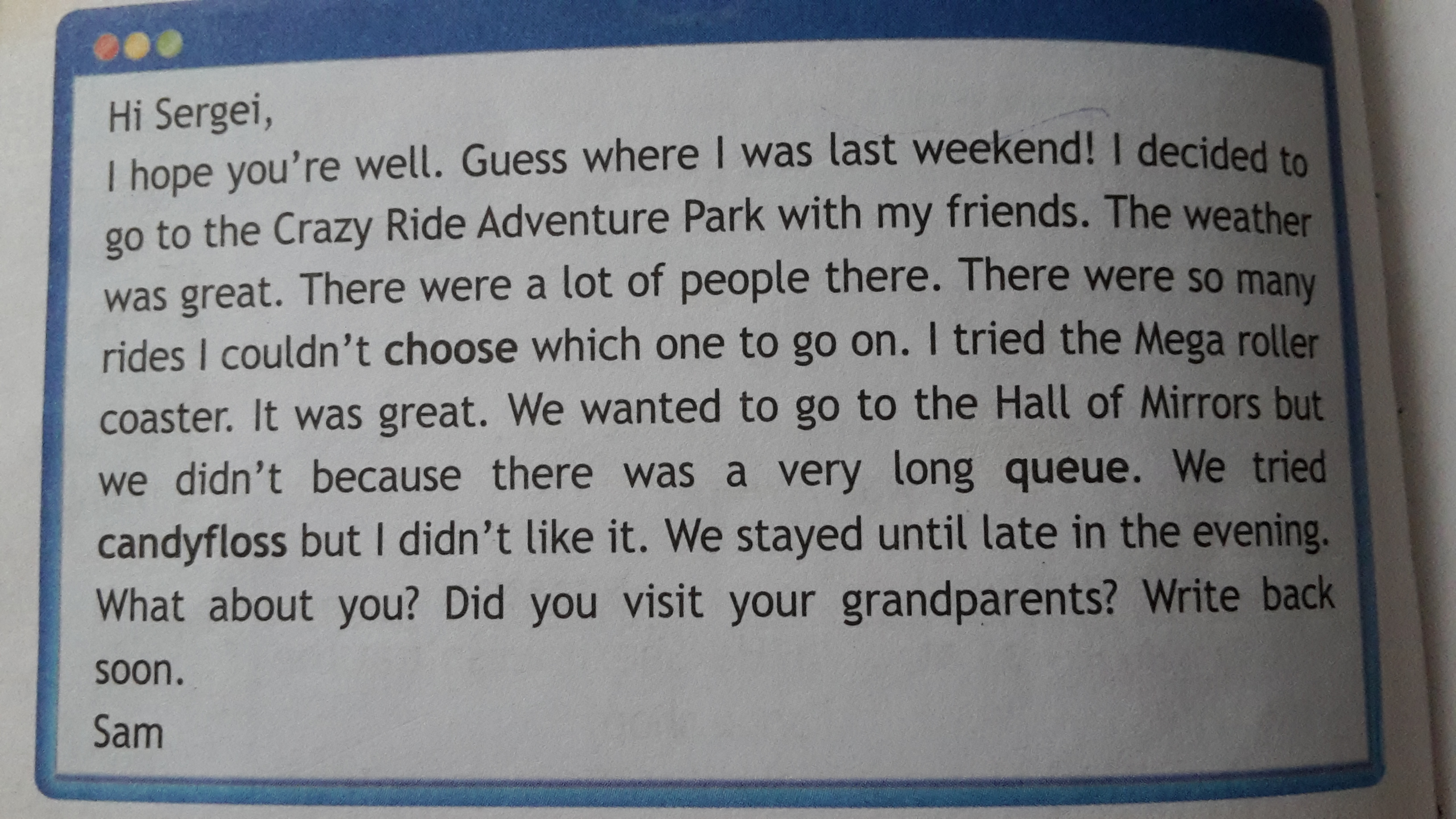 Я надеюсь ты в порядке. Как ты думаешь где я был на прошлой неделе? Я решил поехать Crazy Ride Adventure Park с моими друзьями.Погода была чудесна. Там было много людей.Было много поездок я не мог решить какую поездку продолжить. Я попробовал мега ролик.Это было великолепно. Мы хотели пойти в Комнату Зеркал, но не пошли потому что там была большая очередь. Мы попробовали кэндифлос, но мне не понравилось. Мы оставались там пока не стемнело. Что на счет тебя?Ты посетил деда и бабку? Напиши мне скоро.