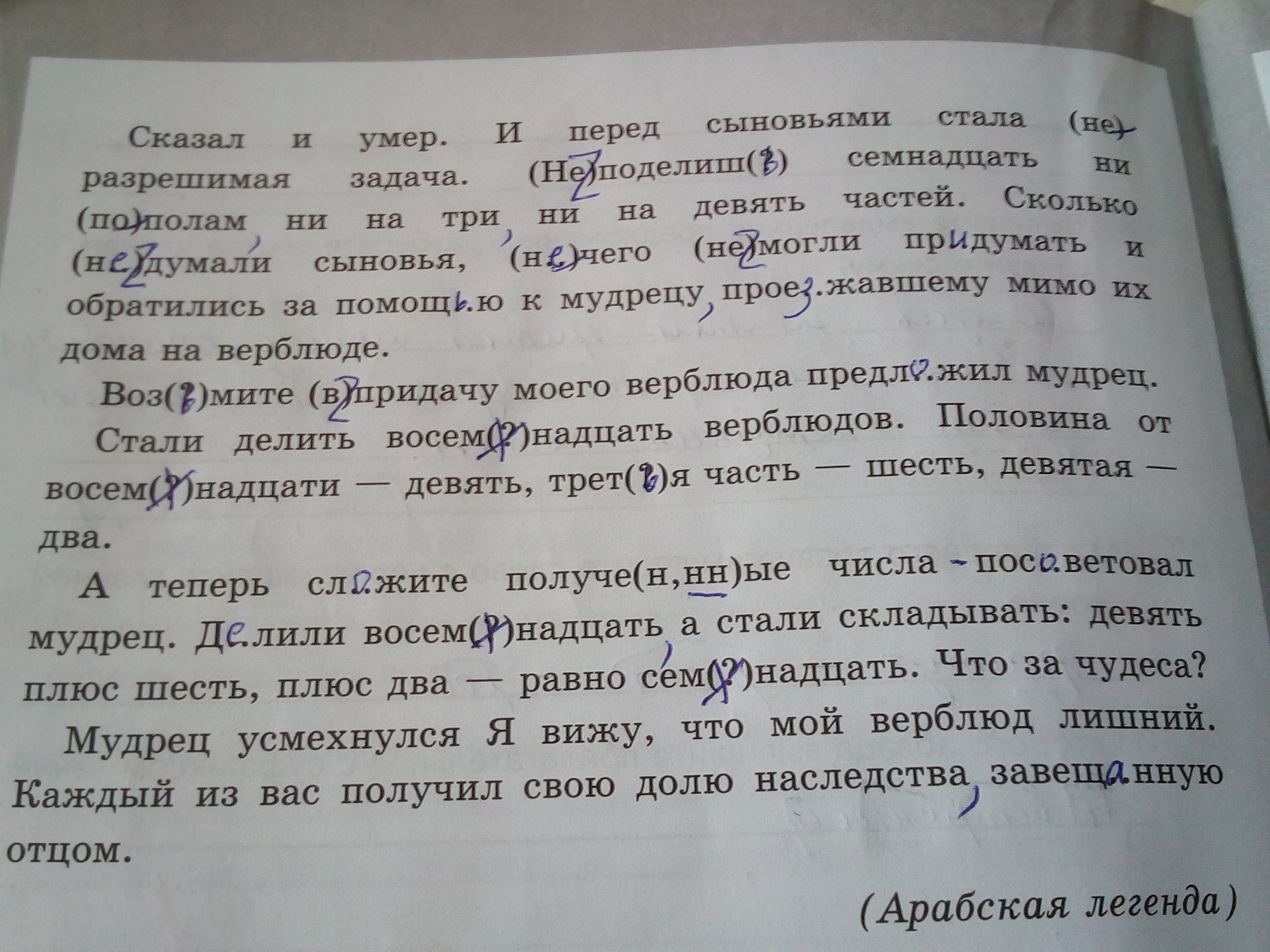 Задание точно не указано,но думаю,что это будет выглядеть так. Умирал старый араб.Трое сыновей собрались выслушать последнюю волю отца."Я оставляю вам семнадцать верблюдов.Поделите между собой наследство так:старшему сыну-половину,среднему-треть,а младшему-девятую часть",-сказал старик.