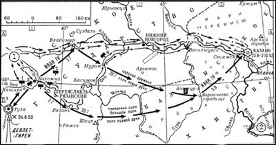 4) в результате событий, обозначенных на схеме, ханство прекратило своё существование, и Среднее Поволжье в значительной своей части было присоединено к России, в итоге возникли предпосылки для освоения русскими переселенцами Поволжья, дальнейшего продвижения на Урал и в Сибирь