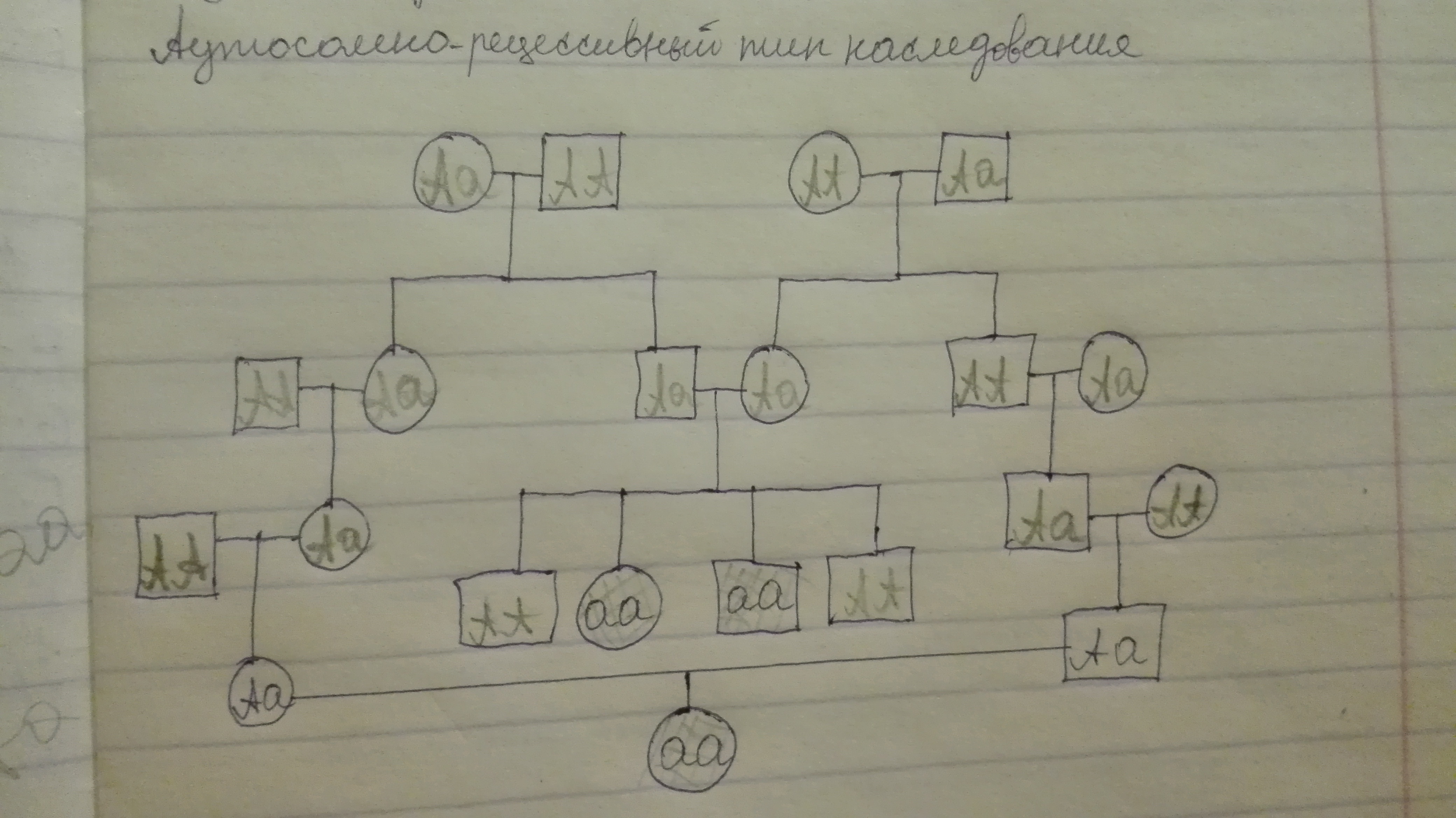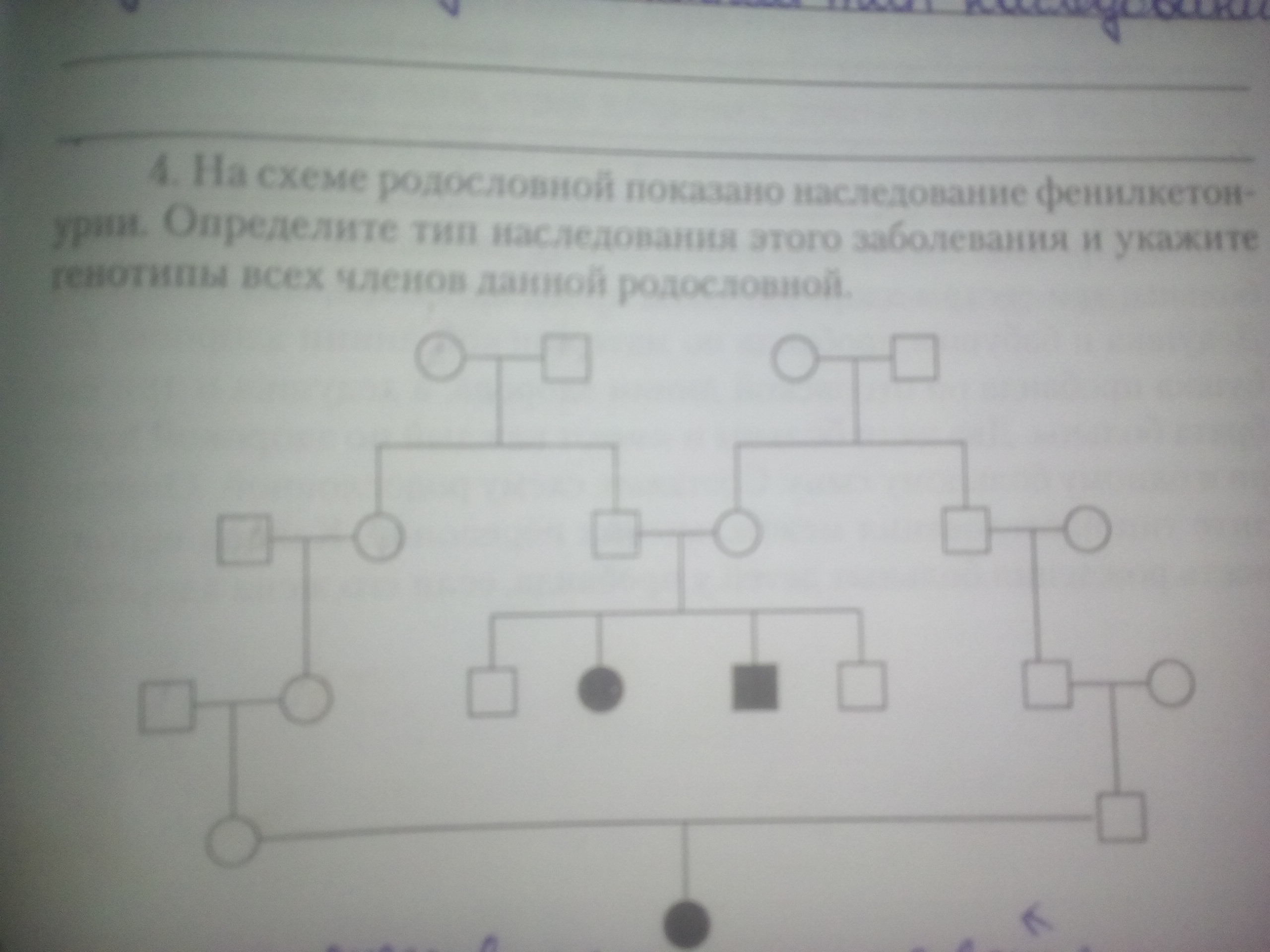 На схеме родословной показано наследование фенилкетонурии.Определите тип наследования этого заболевания и укажите генотипвы всех членов данной родословной