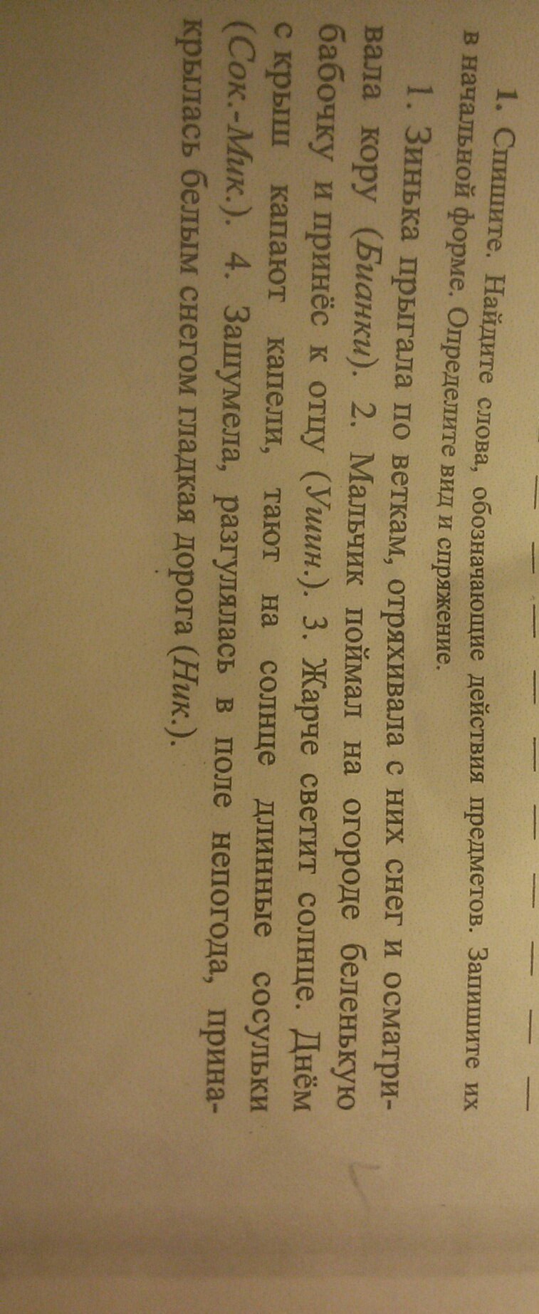 1) Зинька прыгала по веткам, отряхивала с них снег и осматривала кору. (прыгала,отряхивала, осматривала)