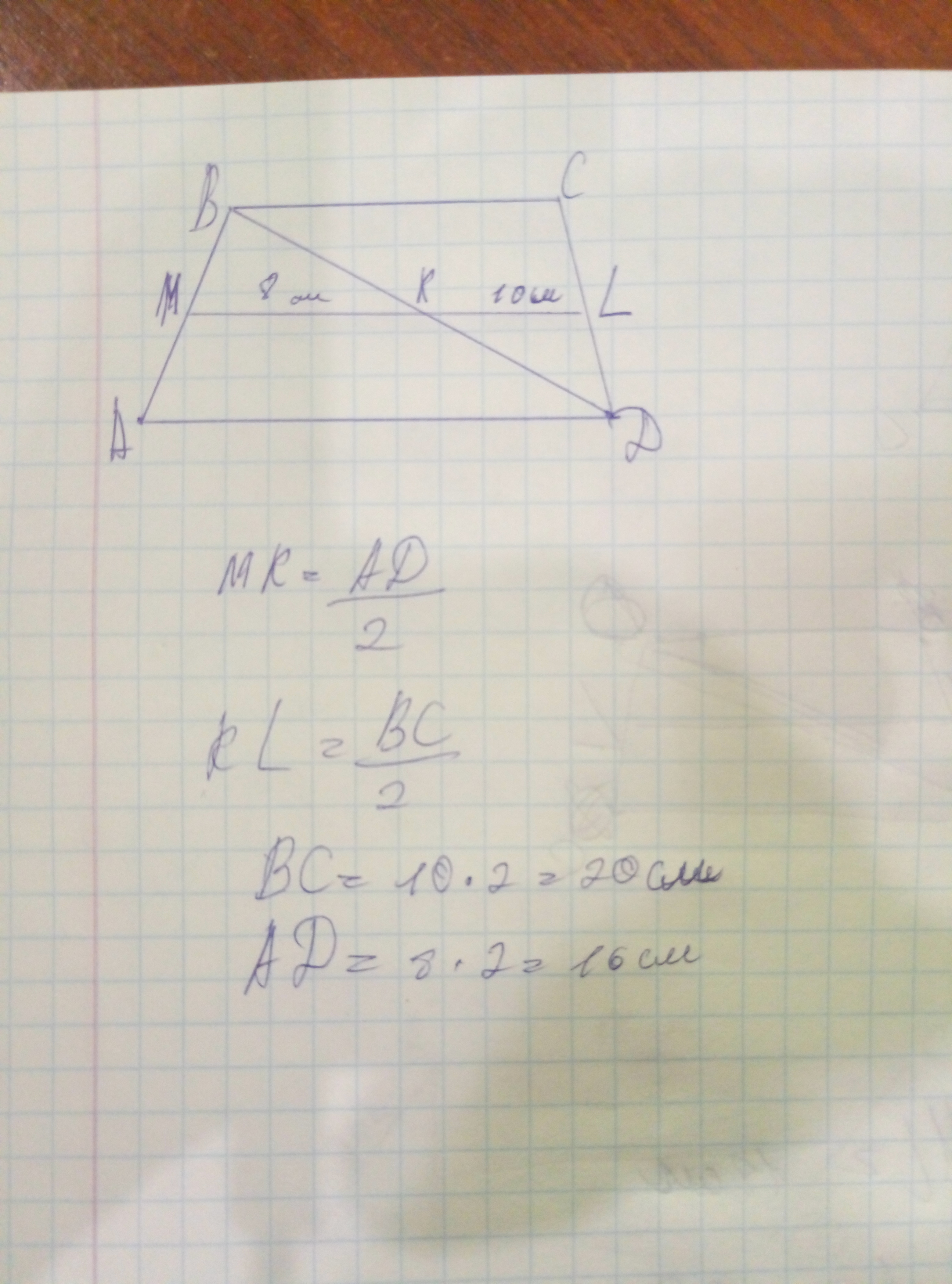 В трапеции ABCD (AD II BC) проведена средняя линия ML (M принадлежит AB, L принадлежит СD), которая пересекает диагональ BD в точке K. Определить длины оснований трапеции, если MK= 8 см, KL= 10 cм
