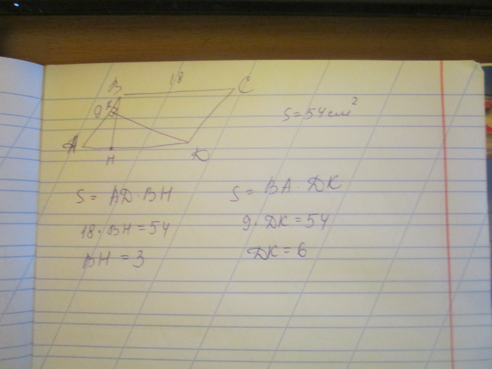 Площадь параллелограмма 54см квадратных.Найди его высоты,если стороны имеют долготу 18 см и 9 см.