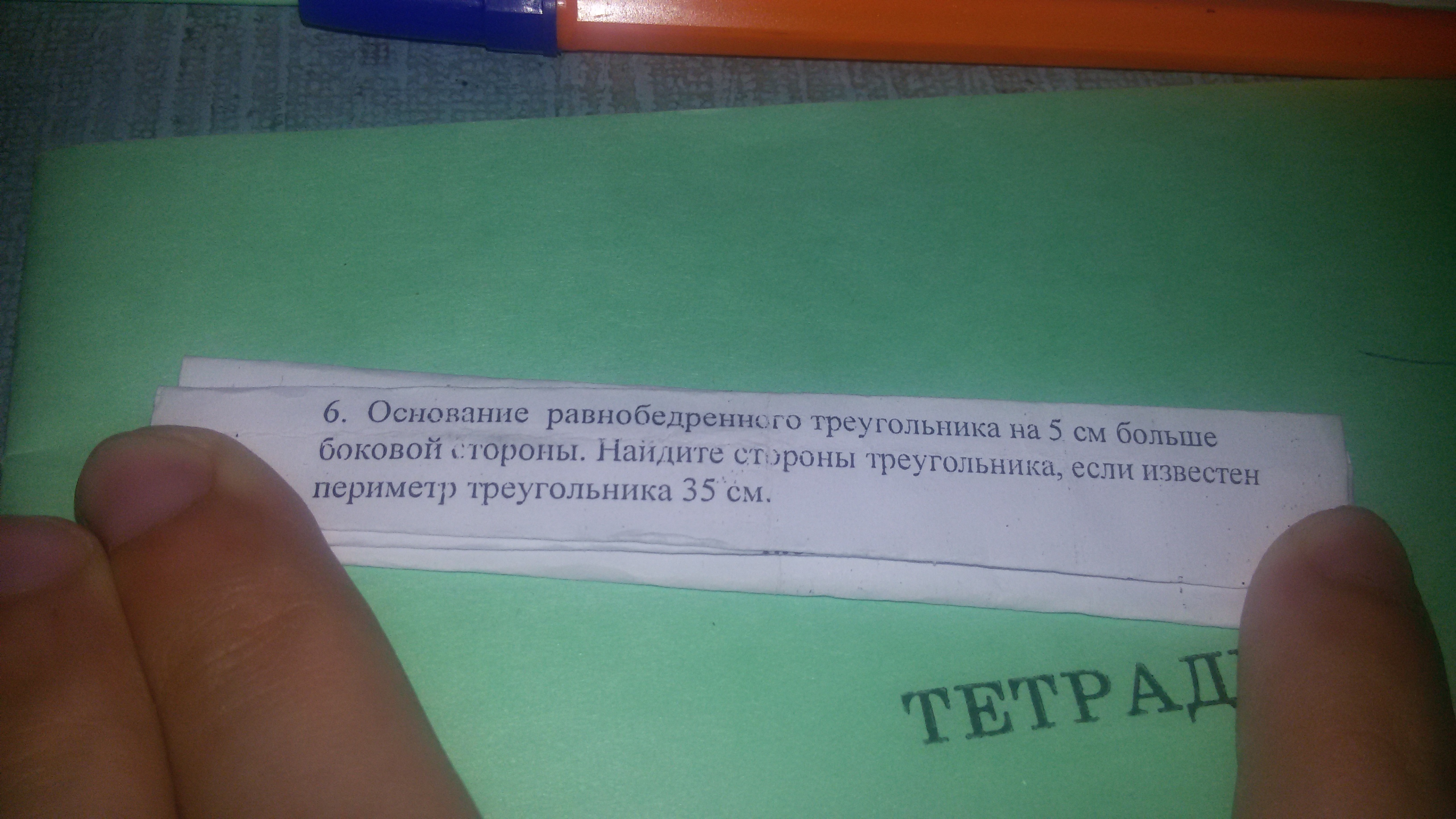 Пусть основание данного треугольника х см, тогда боковая сторона равна х-5 см, а периметр данного треугольника равен х+2*(х-5).