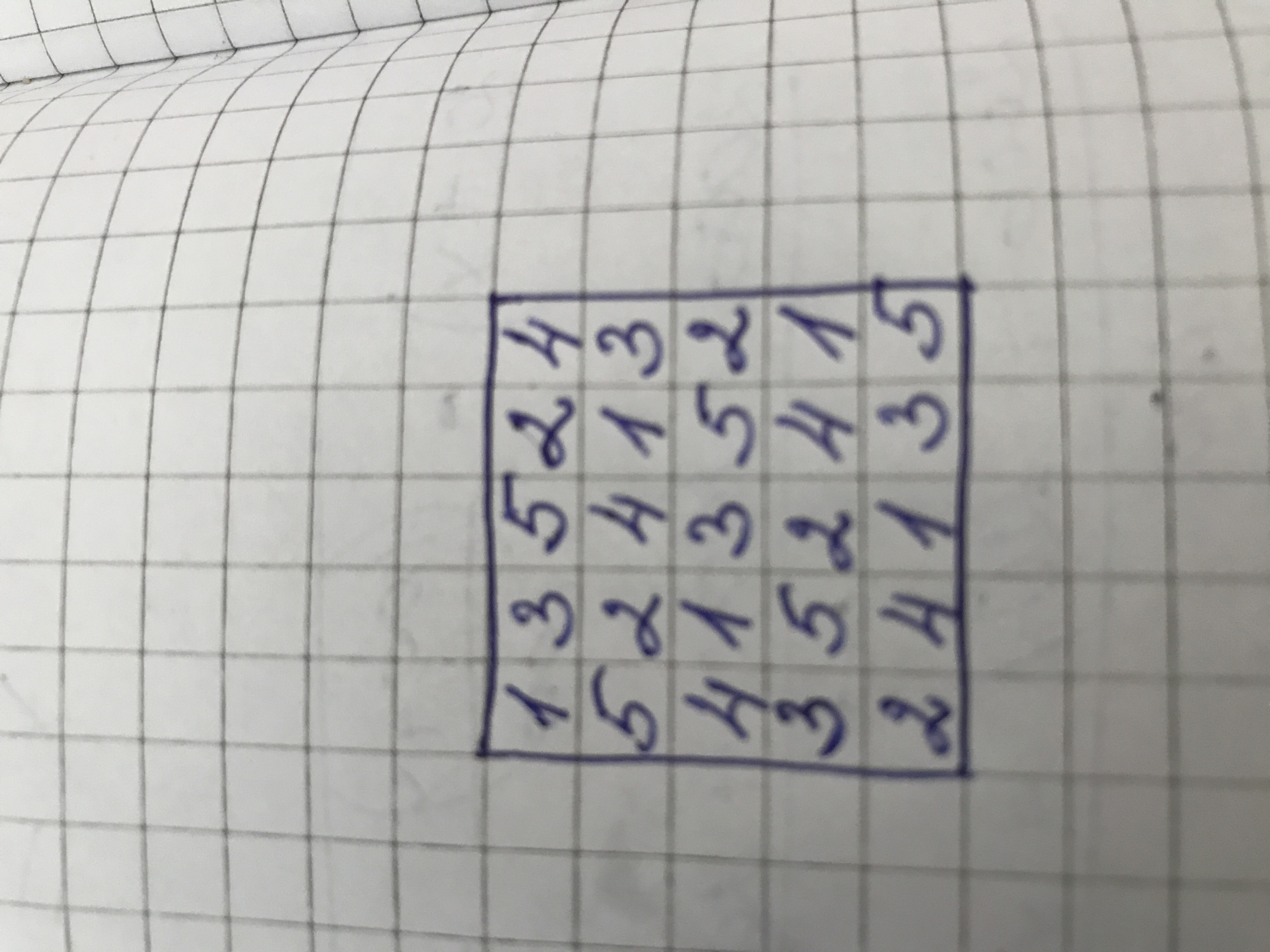 В квадрат 5*5 разместить цифры от 1 до 5 чтобы по горизонтали вертикали и диагонали получить 15 и чтобы цыфры в рядах не повторялись.