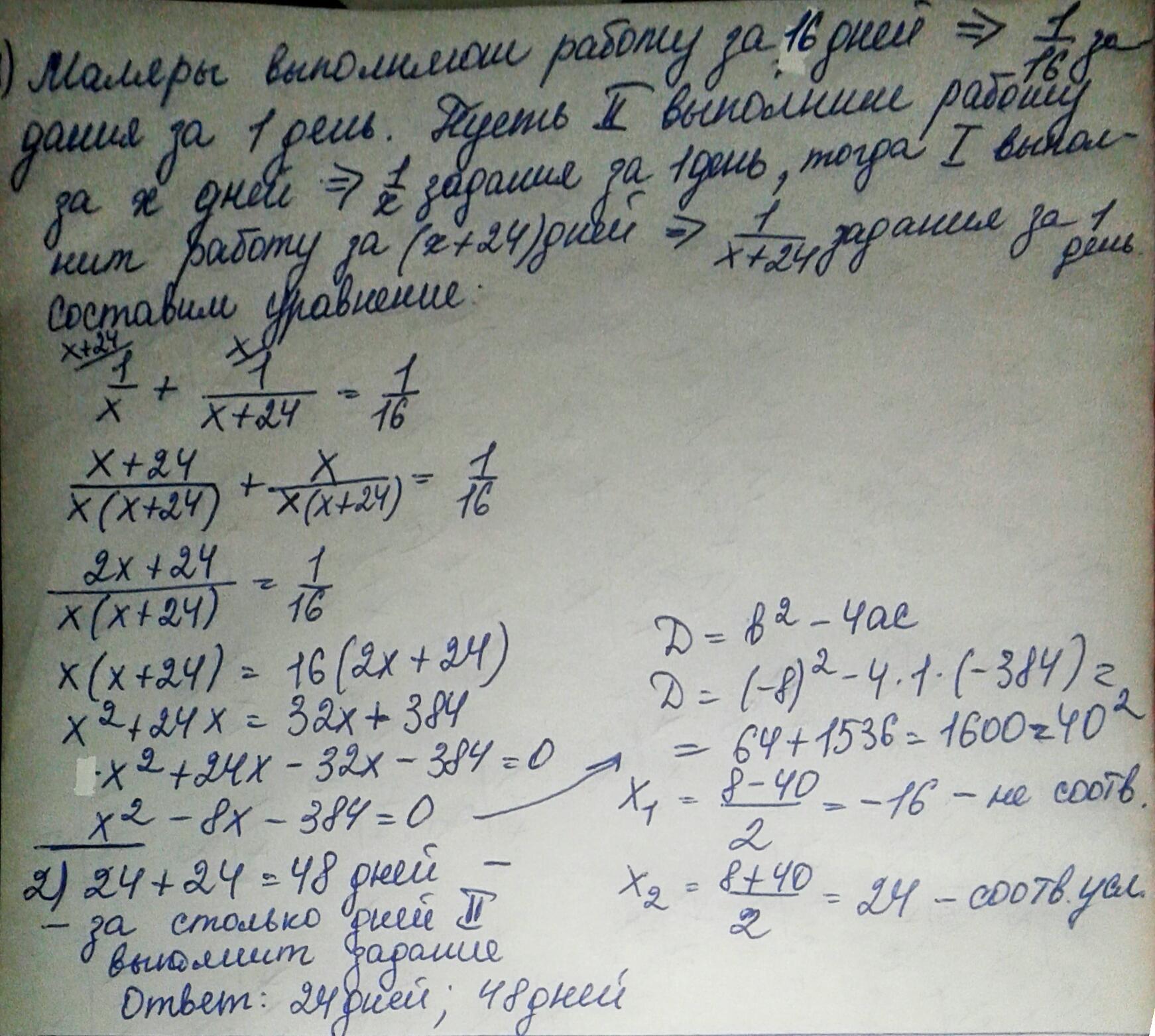 Двоє малярів , виконуючи певне завдання разом, можуть закінчити його за 16 днів . За скільки днів може виконати це завдання кожен із них, працюючи самостійно , якщо першому для цього потрібно на 24 дні менше , ніж другому