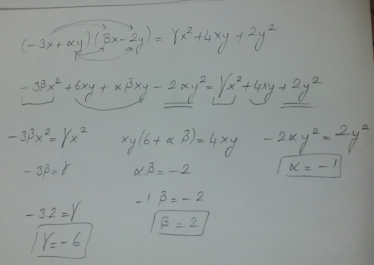 (-3x+αy)(βx-2y)=γx^2+4xy+2y^2