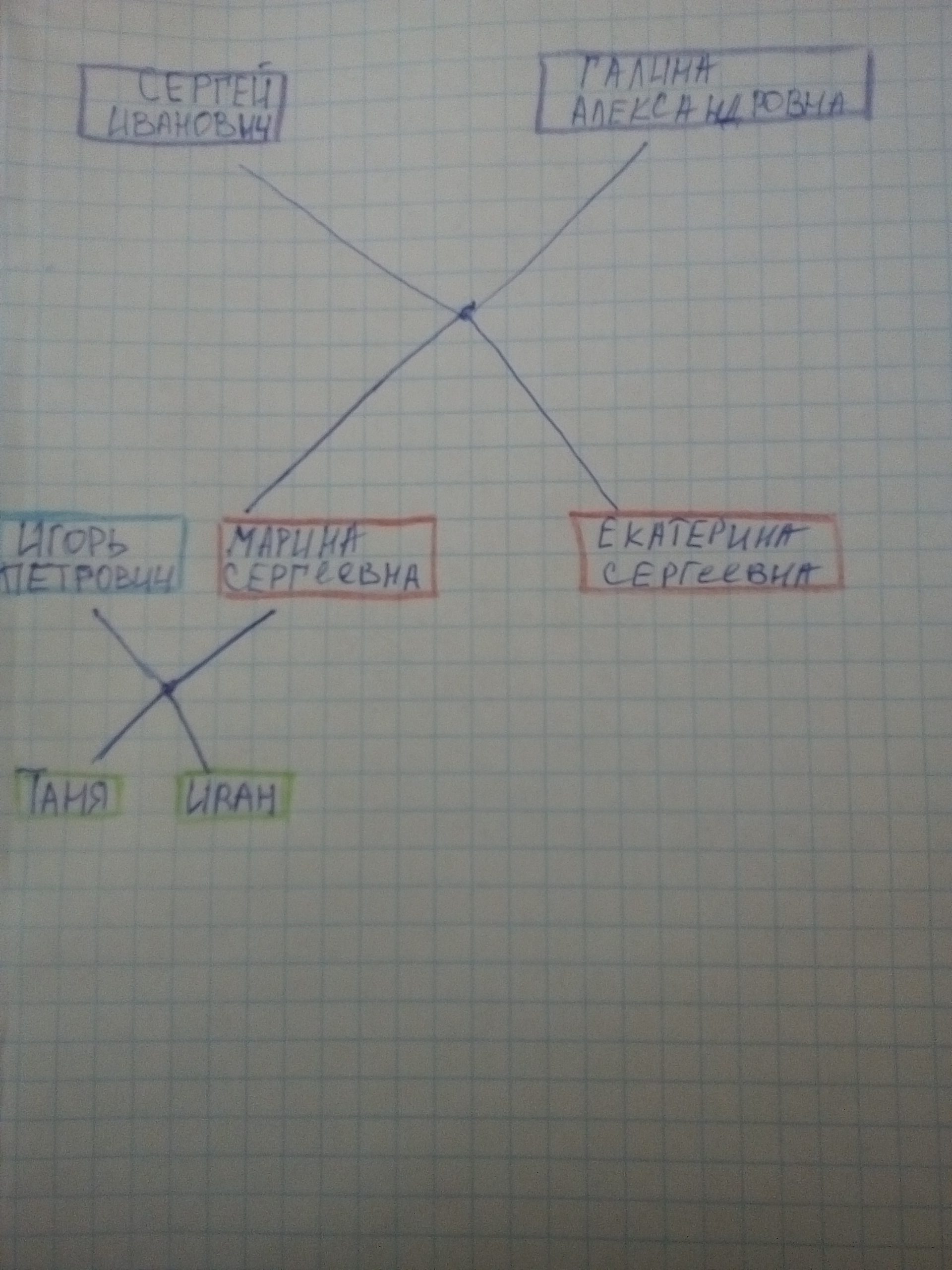 У девочки Тани есть брат Иван, их родителей зовут Марина Сергеевна и Игорь Петрович. У Марины Сергеевны есть сестра Екатерина Сергеевна, а их родителей зовут Сергей. Иванович и Галина Александровна. НАРИСУЙ РОДОСЛОВНУЮ СЕМЬИ