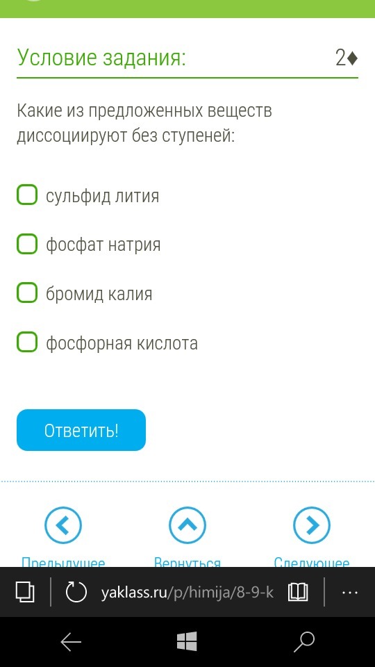 сульфид лития диссоциирует в 2 ступени, фосфорная кислота в 3 ступени, фосфат калия тоже в 3 ступни, а бромид калия в 1, поэтому верный только один вариант здесь