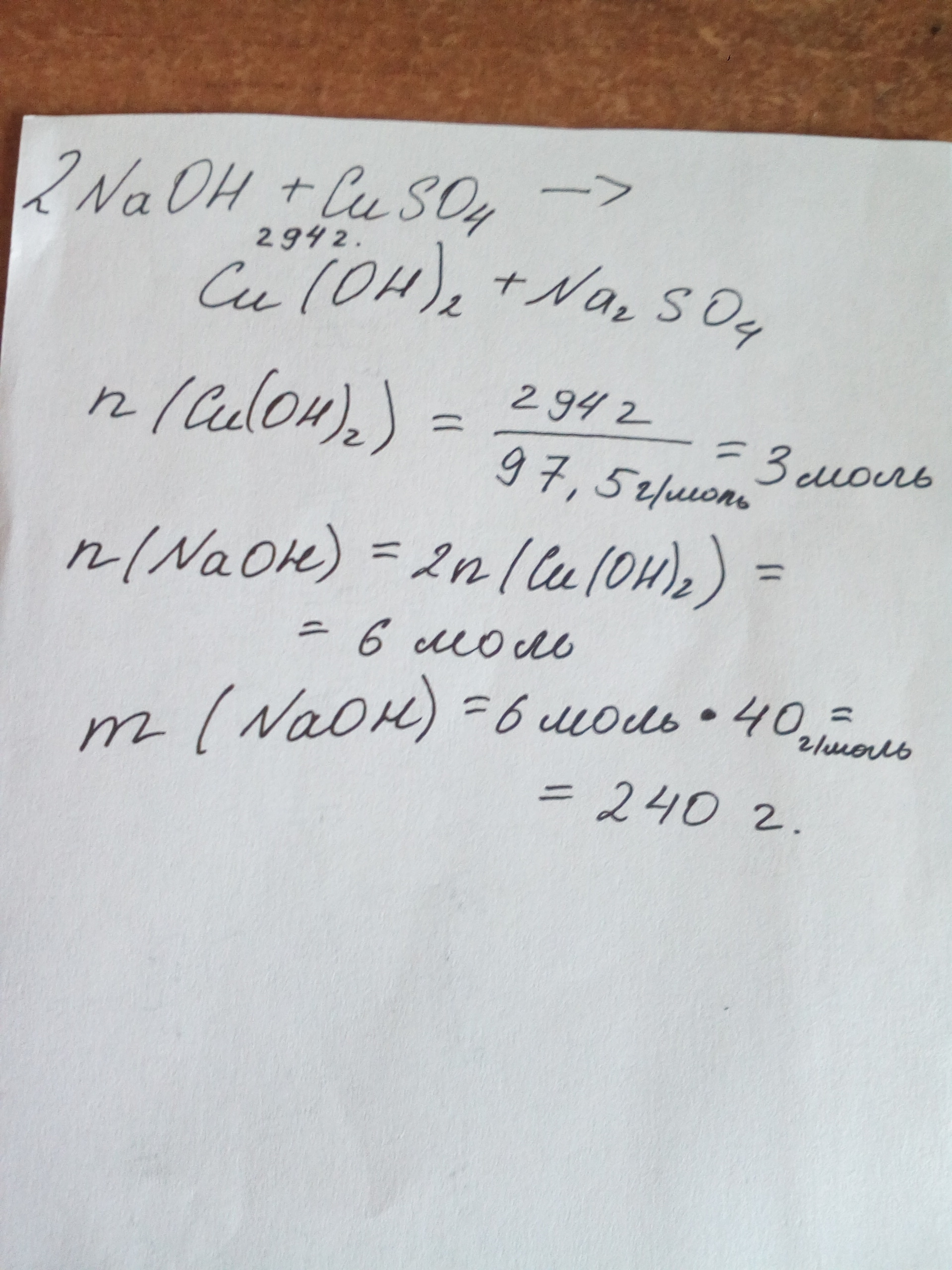 Найдите массу гидроксида натрия, которая необходима для получения 294 г гидроксида меди из сульфата