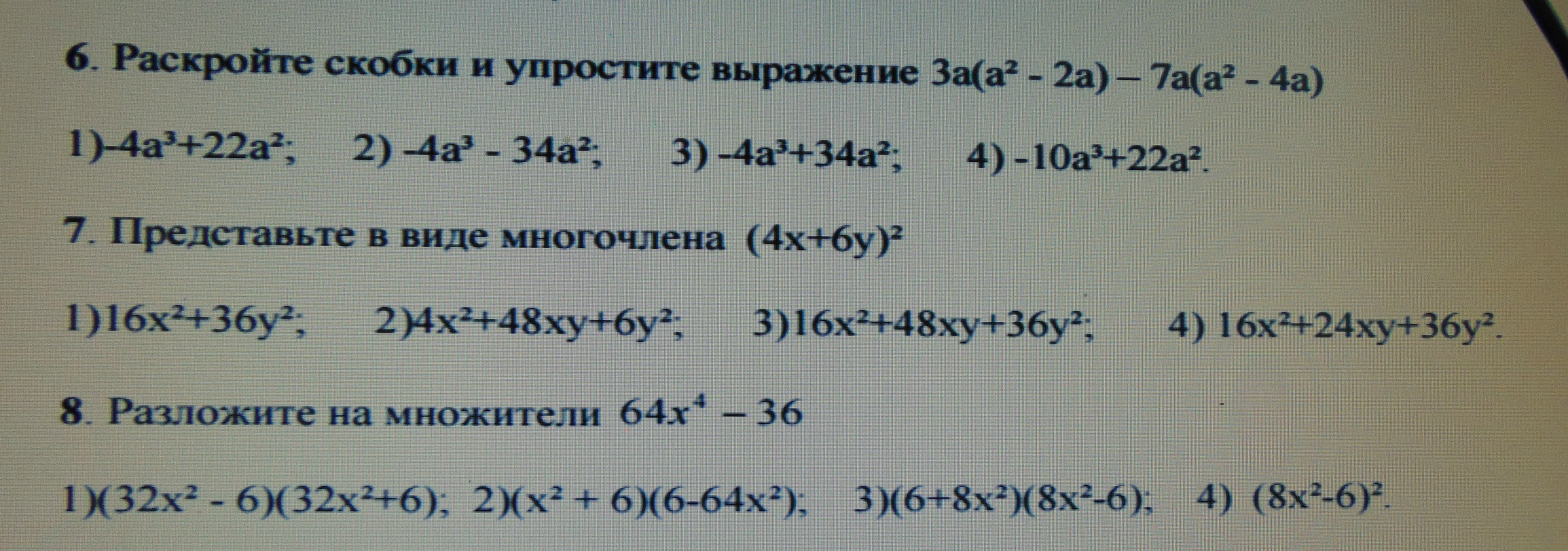 6).3a^3-6a^2-7a^3+28a^2= -4a^3+22a^2. ответ: цифра 1. 7).(4x+6y)^2=(4x)^2+2*4x*6y+(6y)^2=16x^2+48xy+36y^2. ответ: цифра : 3. 8).64x^4-36=(8x^2)^2-(6)^2=(8x^2-6)(8x^2+6). ответ: цифра 3.