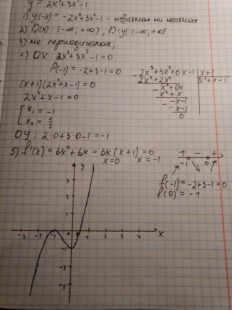 Постройте график функции с полным исследованием функции y=2x^3+3x^2-1
